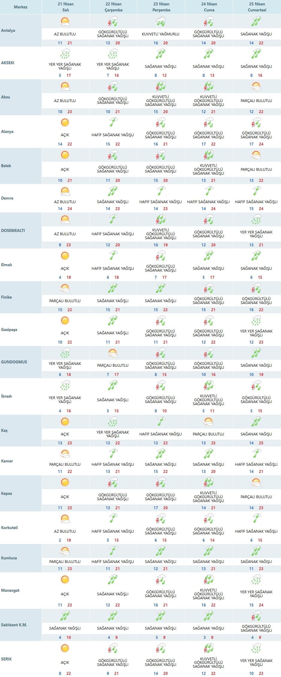Antalya kent merkezinde az bulutlu bir gökyüzü hakim olurken sıcaklıkların 21 derece civarında seyretmesi bekleniyor; ancak Kepez, Aksu ve Döşemealtı gibi noktalarda termometreler 23 dereceye kadar tırmanarak yazdan kalma bir gün yaşatacak. Güneşin en cömert olduğu Alanya, Belek, Kaş, Manavgat ve Serik gibi turizm merkezlerinde ise gökyüzü tamamen açık ve pırıl pırıl bir gün vadediyor. Kentin en sıcak noktası 24 derece ile Demre olurken, Kumluca ve Finike çevrelerinde parçalı bulutlu bir hava hakim olacak.