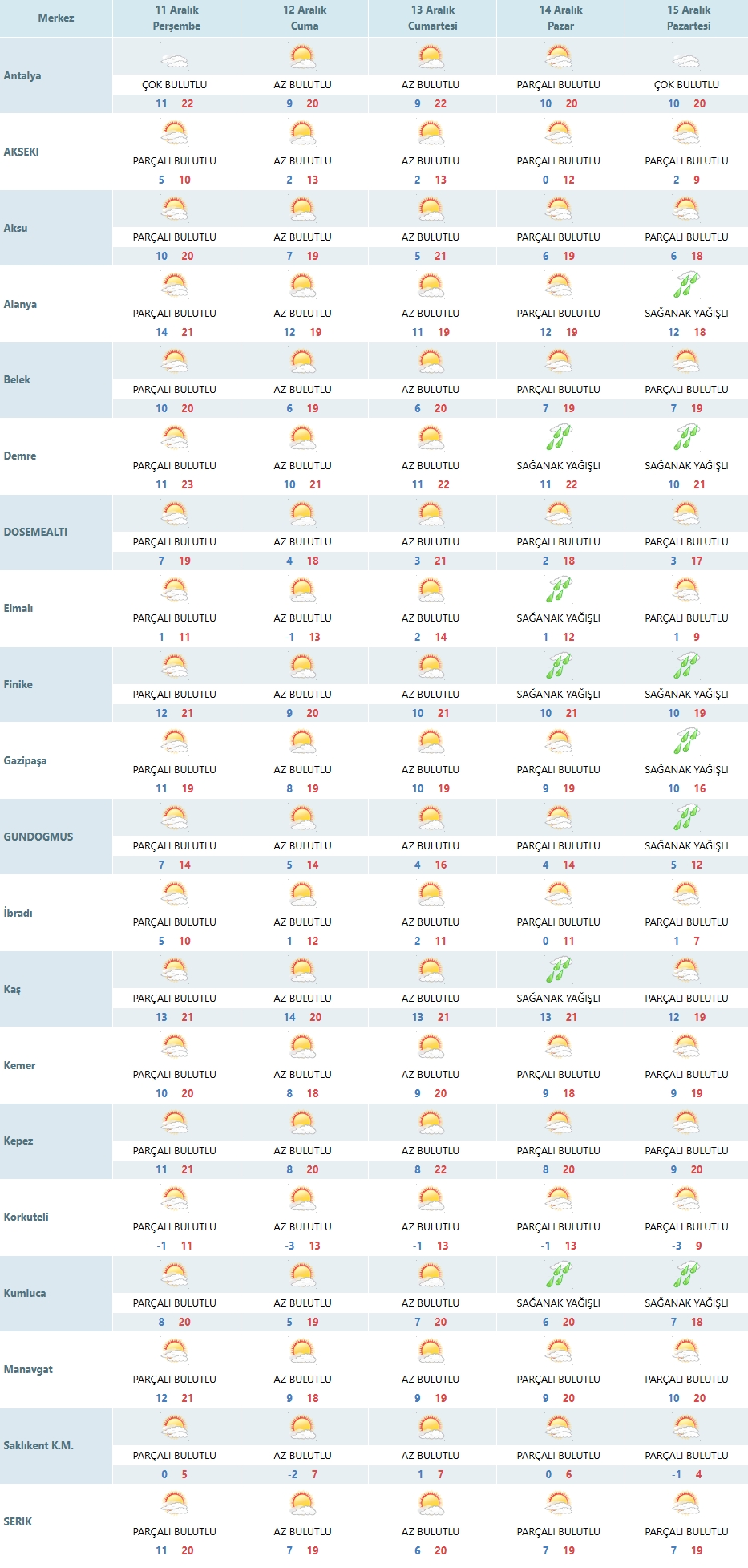 Elmalı, Korkuteli ve İbradı gibi yüksek rakımlı bölgelerde sıcaklıklar belirgin şekilde daha düşük. Elmalı’da sabah 0 dereceye kadar düşen hava sıcaklığı gün içinde 11 dereceye çıkıyor. Korkuteli’nde de tablo benzer; hava 11 Aralık’ta parçalı bulutlu ve 0 ile 11 derece arasında seyrediyor. Bu bölgelerde sabah saatlerinde soğuk hava daha etkili olduğundan özellikle erken saatlerde dışarı çıkacaklar için katmanlı giyim öneriliyor.