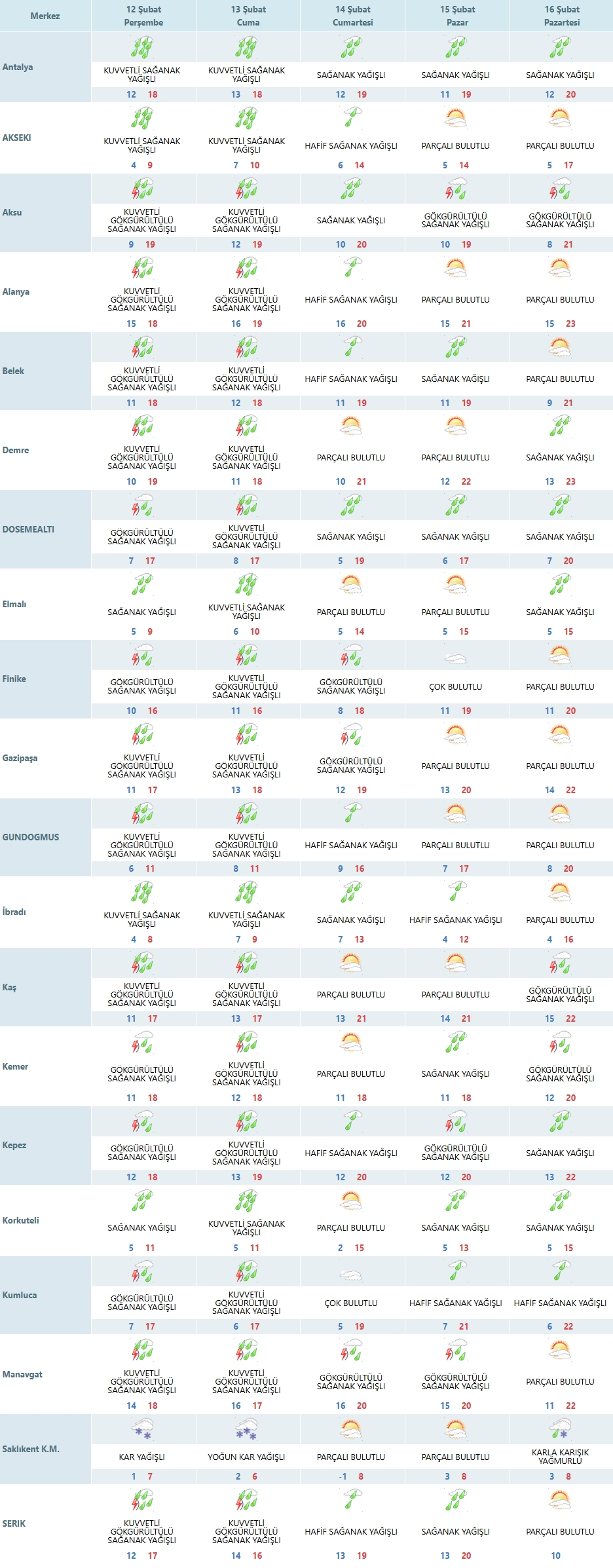 Demre ve Kaş: Batı hattında da durum farksız; gök gürültülü ve kuvvetli yağışlar gün boyu hakim (10-19°C).