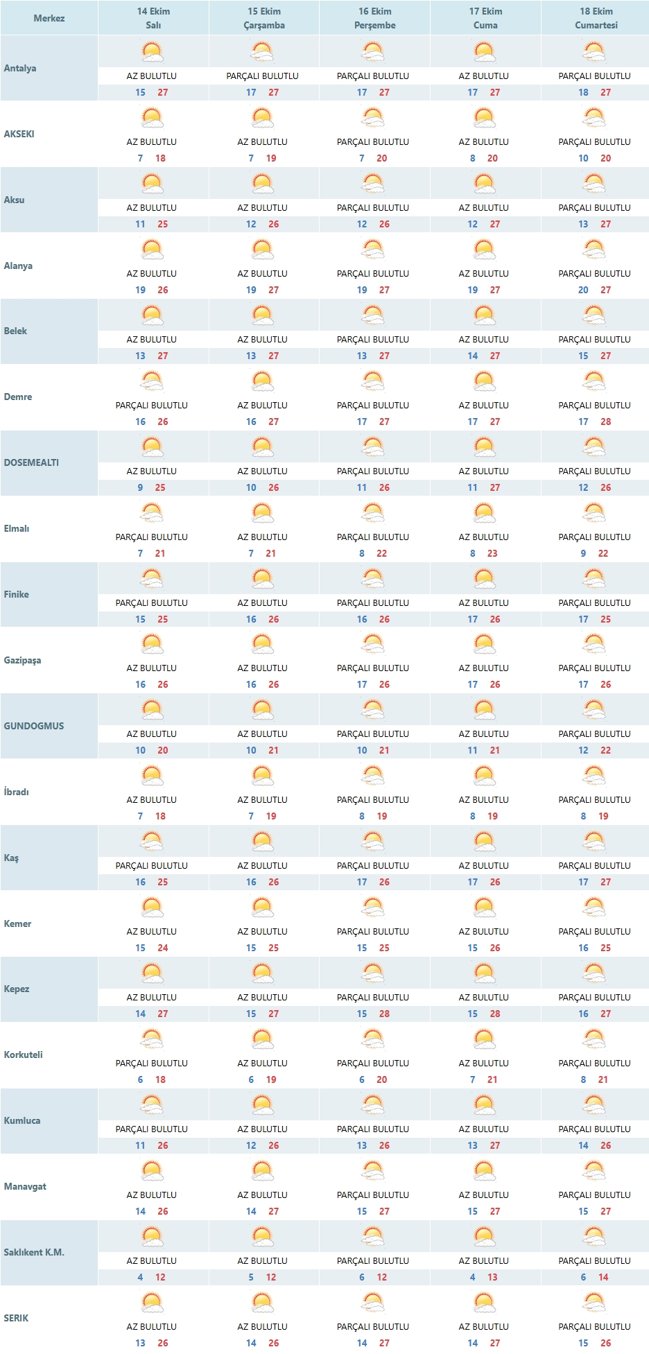 Antalya’nın ilçelerinde de benzer bir hava durumu hâkim olacak. Alanya, Kemer, Serik, Belek ve Manavgat’ta hava az bulutlu, sıcaklıklar ise 25-27 derece civarında seyredecek.