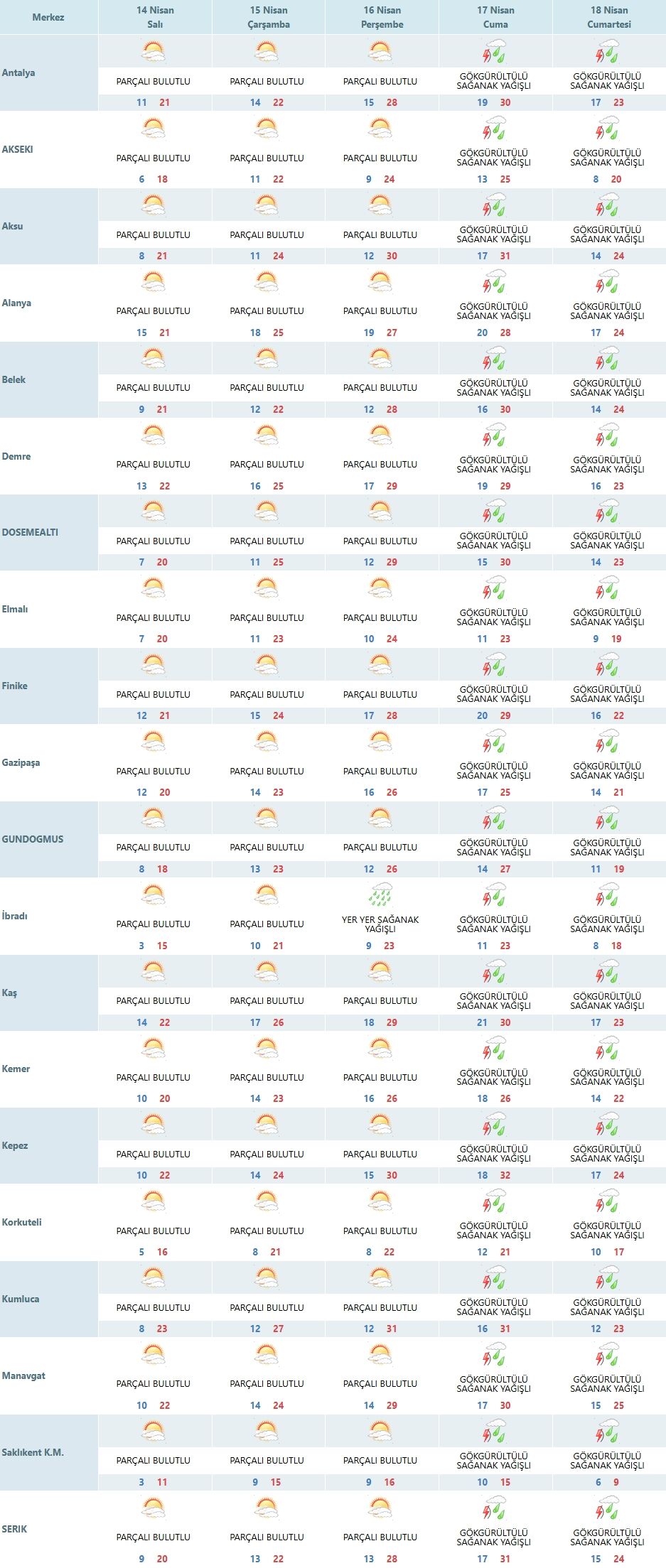 14 Nisan Salı günü Antalya’da yağış beklenmemesi dikkat çekiyor. Ancak bu sakin tablo uzun sürmeyecek. Verilere göre 17 Nisan Cuma gününden itibaren gök gürültülü sağanak yağışların yeniden etkili olması bekleniyor. Bu nedenle 14 Nisan, yağış öncesi kısa bir mola niteliği taşıyor.