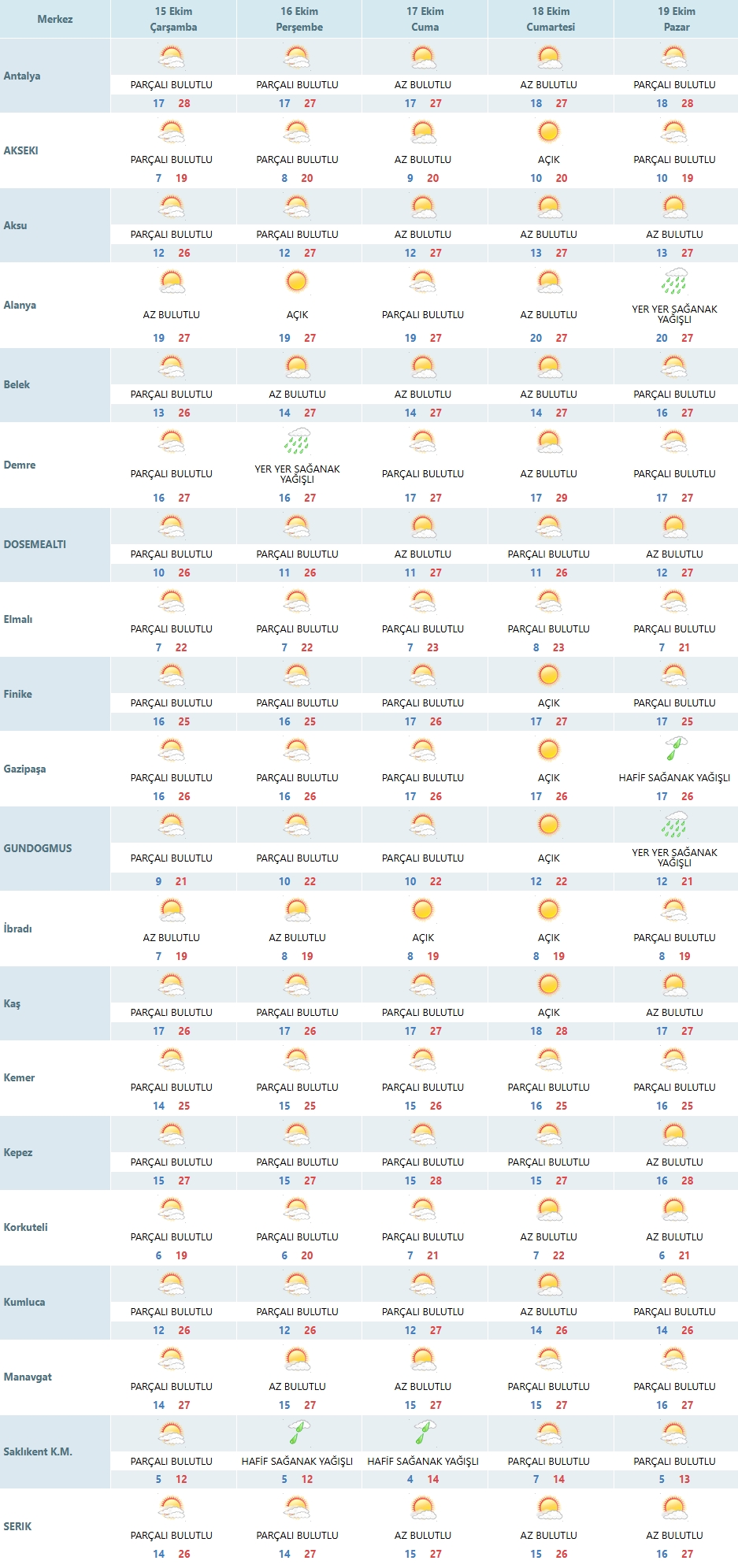 Antalya genelinde 15 Ekim Çarşamba günü çoğunlukla parçalı bulutlu bir hava hakim olacak. İşte ilçe ilçe detaylı tahminler:
