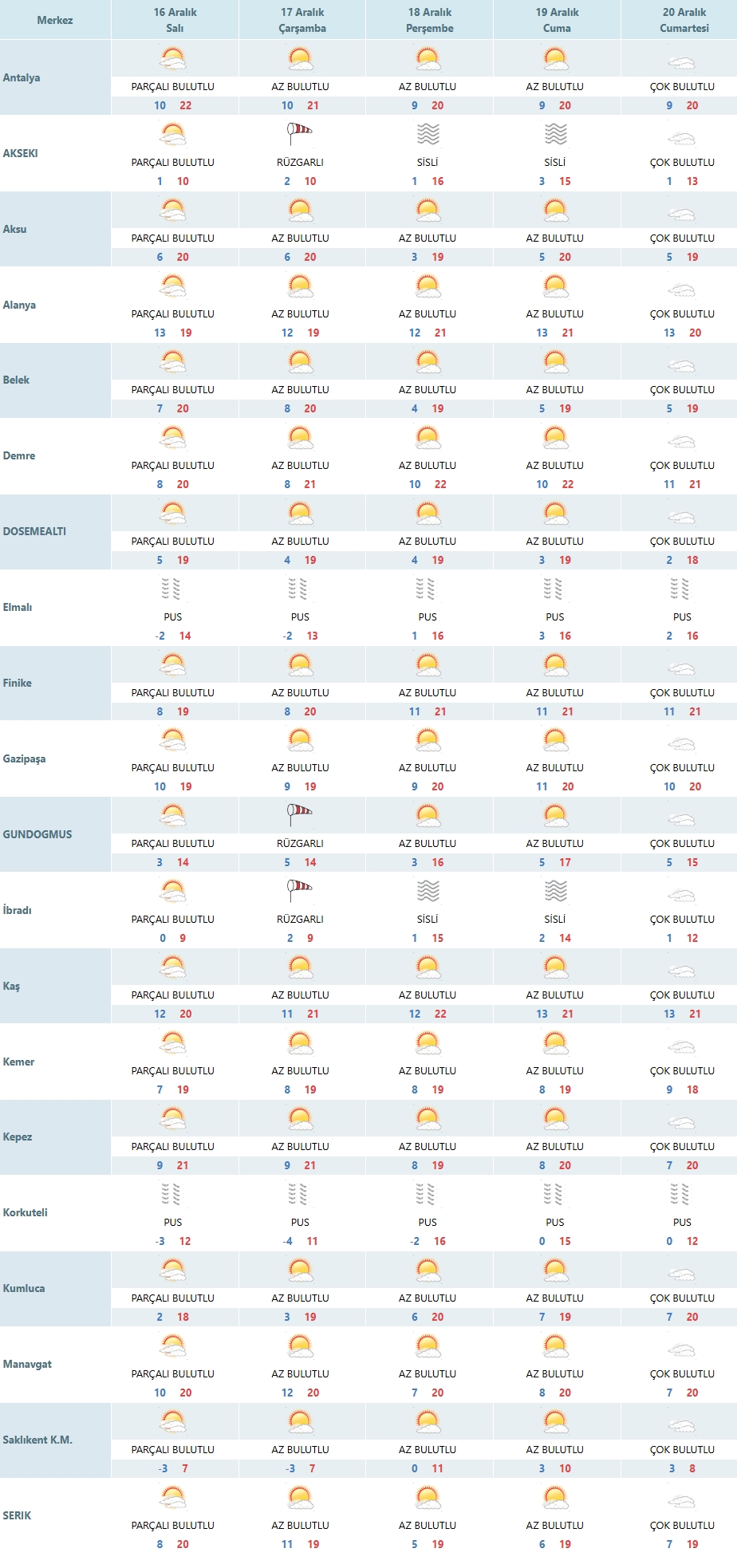 Antalya’nın ilçelerinde ise hava durumu bölgesel farklılıklar gösteriyor. Aksu, Alanya, Belek, Demre, Finike, Gazipaşa, Kaş, Kemer, Manavgat ve Serik’te parçalı bulutlu bir hava bekleniyor. Bu ilçelerde gündüz sıcaklıkları 18 ila 20 derece arasında değişiyor.
