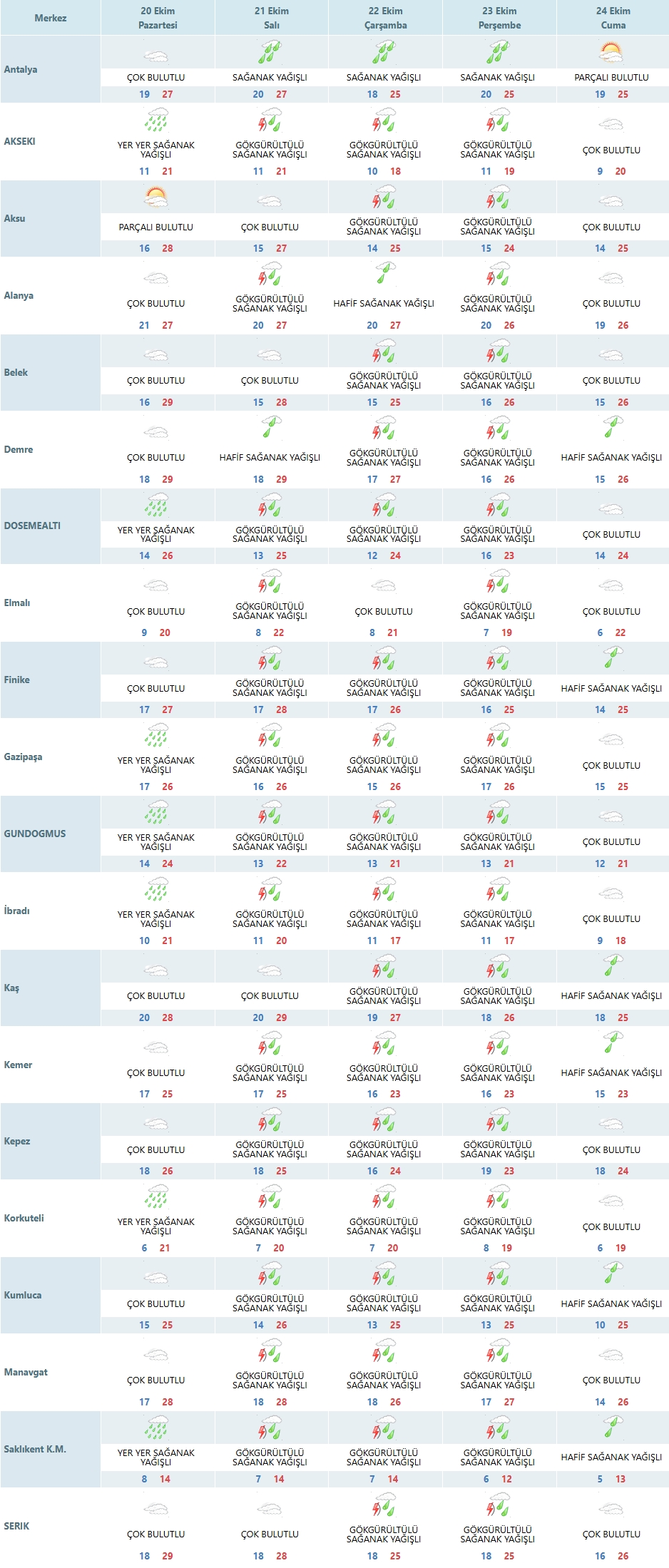 • Alanya, Kemer, Kaş, Manavgat, Serik ve Finike ilçelerinde ise gün genelinde çok bulutlu hava etkili olacak.