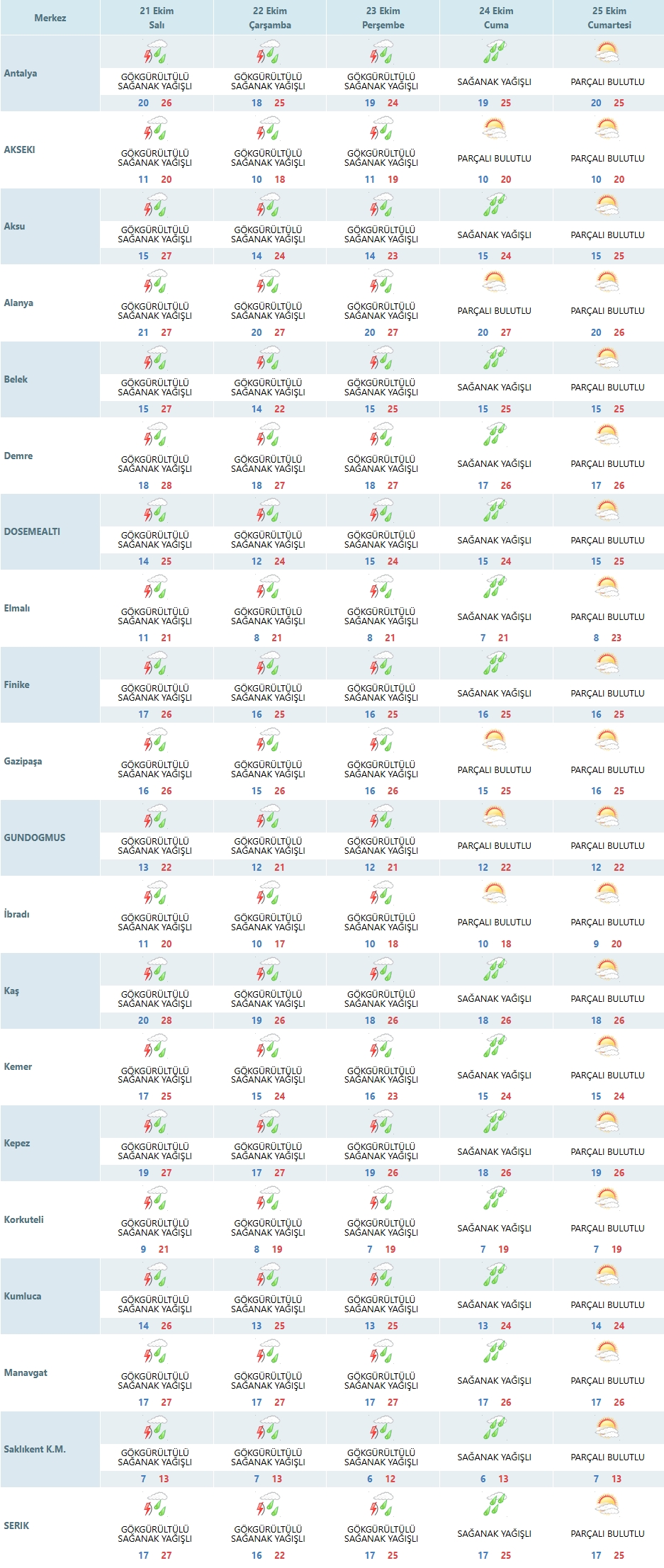 İç kesimlerde yer alan Elmalı, Korkuteli ve Akseki gibi ilçelerde ise hava sıcaklıklarının 8 ila 21 derece aralığında olacağı, yağışların zaman zaman kuvvetli seyredebileceği bildirildi.