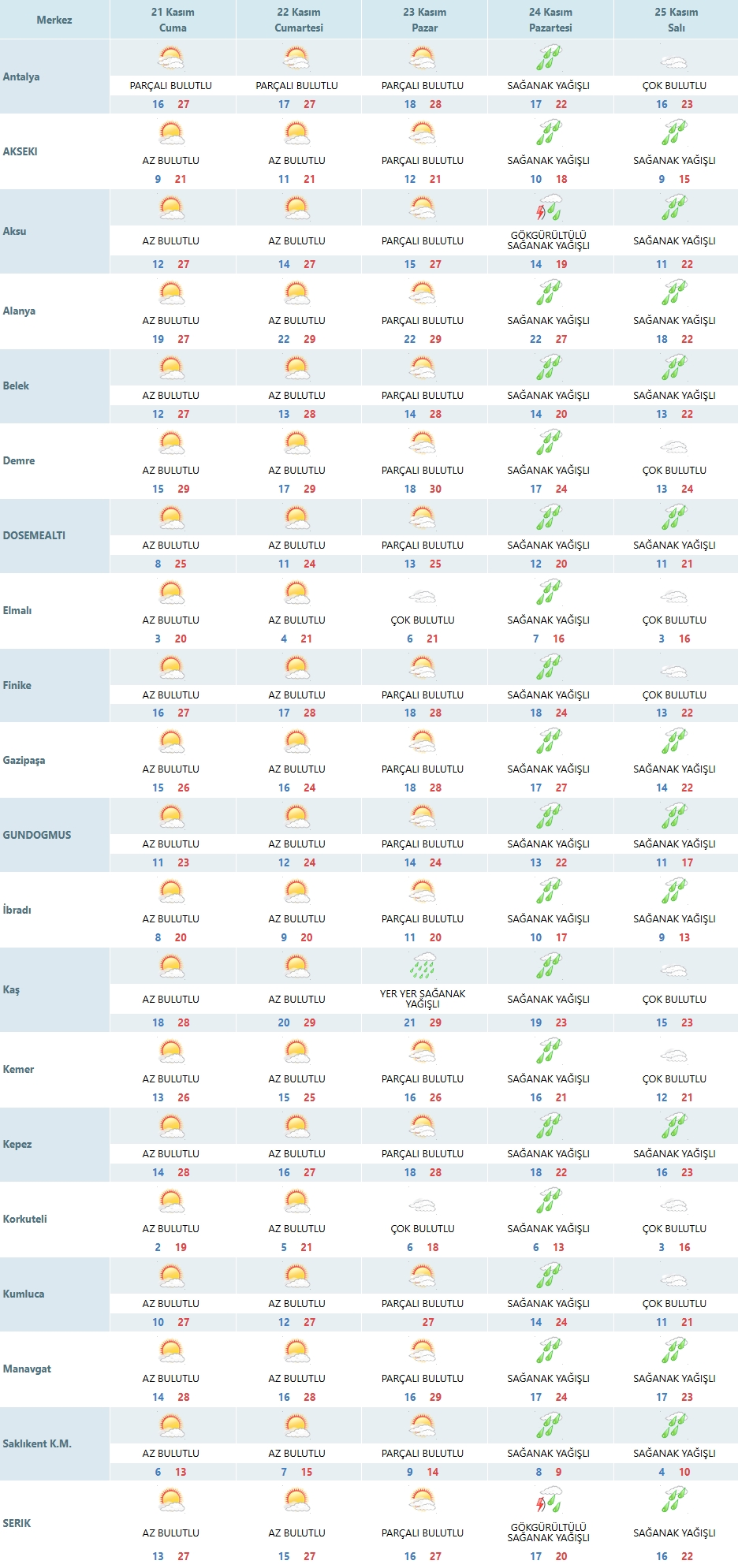 Antalya’da 21 Kasım Cuma günü beklenen 27 derecelik en yüksek sıcaklık, kasım ayının son haftası için görece yüksek bir değer olarak dikkat çekiyor. Sabah 16 derece civarında seyreden hava, öğle saatlerinden itibaren hızla ısınıyor. Bu durum özellikle turistik bölgelerde hareketliliği artırabilir. Kentin merkez ilçelerinde sıcaklık değerleri birbirine yakın seyrederken, yüksek kesimlerde sabah serinliğinin biraz daha belirgin olduğu görülüyor. Meteoroloji uzmanları, sıcaklıkların hafta sonuna doğru yer yer değişkenlik göstereceğine işaret ediyor.