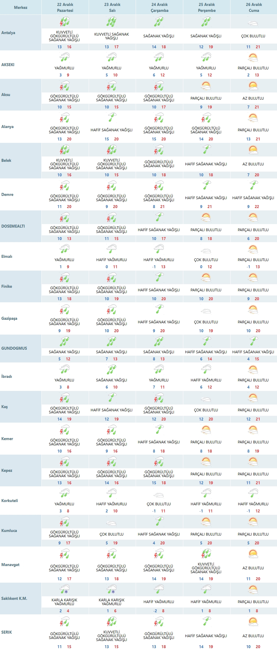 22 Aralık Pazartesi günü Antalya merkezde hava kuvvetli gök gürültülü sağanak yağışlı olacak. Günün en düşük sıcaklığı 13 derece, en yüksek sıcaklığı ise 16 derece civarında ölçülecek. Yağışın özellikle öğle saatlerinden sonra yer yer şiddetini artırması bekleniyor. Kısa süreli ama etkili sağanaklar, su birikintilerine ve trafikte aksamalara neden olabilir. Bulutluluk oranı gün boyunca yüksek seyrederken, güneşin kendini göstermesi beklenmiyor. Nem oranının artmasıyla birlikte hava bunaltıcı hissedilebilir.