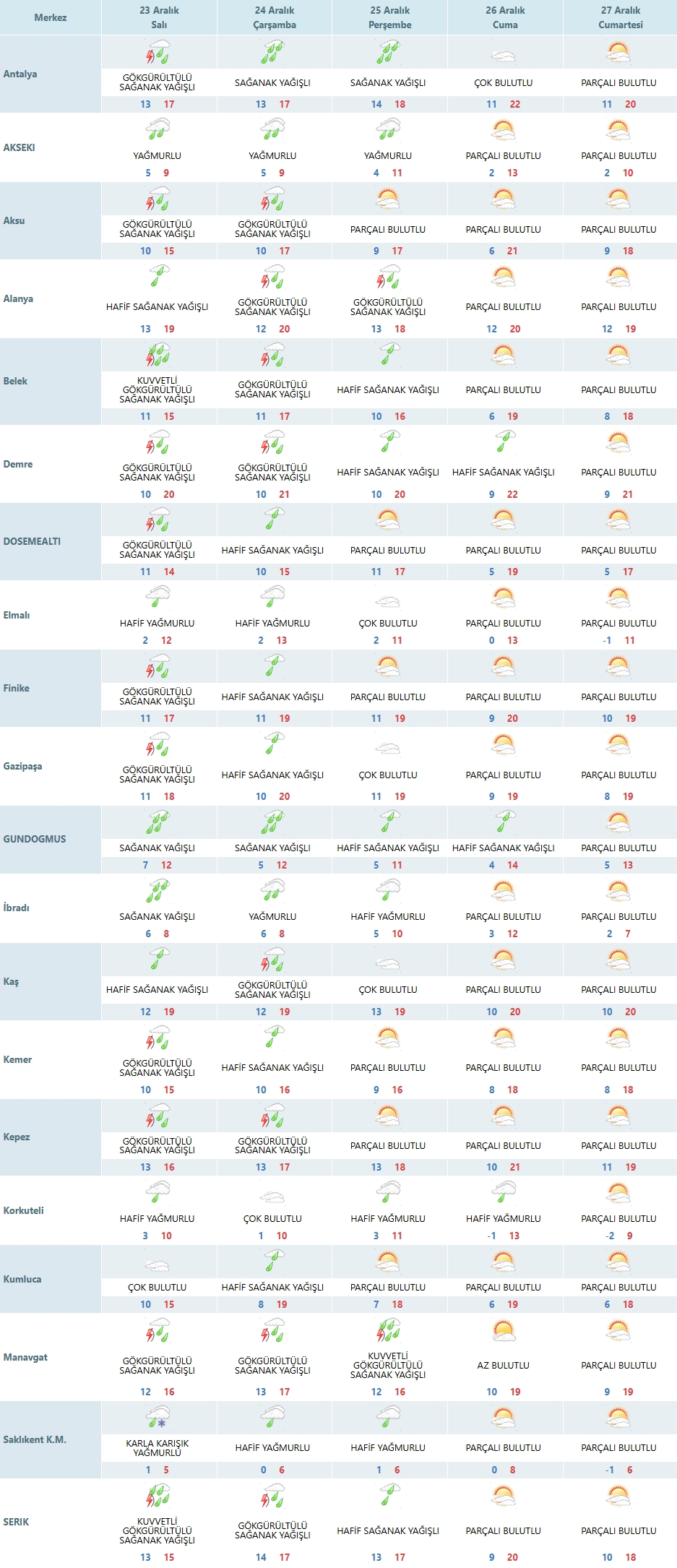 23 Aralık Salı günü Antalya merkezde hava gök gürültülü sağanak yağışlı olacak. Günün en düşük sıcaklığı 13, en yüksek sıcaklığı ise 17 derece civarında ölçülecek. Aksu, Kepez, Muratpaşa ve Konyaaltı çevresinde de benzer bir hava hakim. Bu bölgelerde yağışların zaman zaman kuvvetlenmesi beklenirken, kısa süreli rüzgâr artışları da görülebilir. Alanya, Manavgat, Serik ve Belek gibi turistik ilçelerde ise gök gürültülü sağanak yağış gün boyunca etkili olacak. Sıcaklıkların 15-20 derece bandında seyretmesi bekleniyor. Yağışla birlikte görüş mesafesinde düşüş yaşanabileceği için özellikle trafikte olan sürücülerin dikkatli olması öneriliyor.