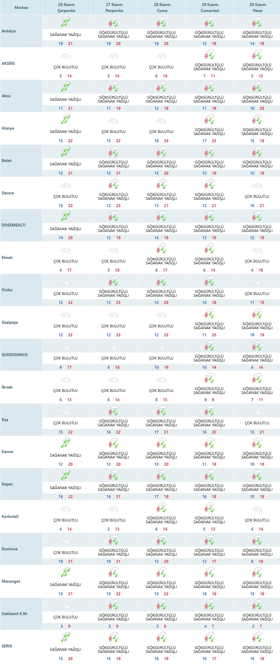 Alanya, Kemer, Manavgat ve Serik gibi sahil hattındaki ilçelerde de sağanak yağış hakim olacak. Bazı bölgelerde yağışın yer yer gök gürültülü şekilde görüleceği tahmin ediliyor. İlçelerde sıcaklıklar 12 ila 22 derece arasında değişirken, özellikle öğleden sonra yağışın kuvvetlenme ihtimali bulunuyor. Turizm bölgelerinde dış mekân etkinlikleri planlayanların hava durumunu yakından takip etmesinde fayda var.