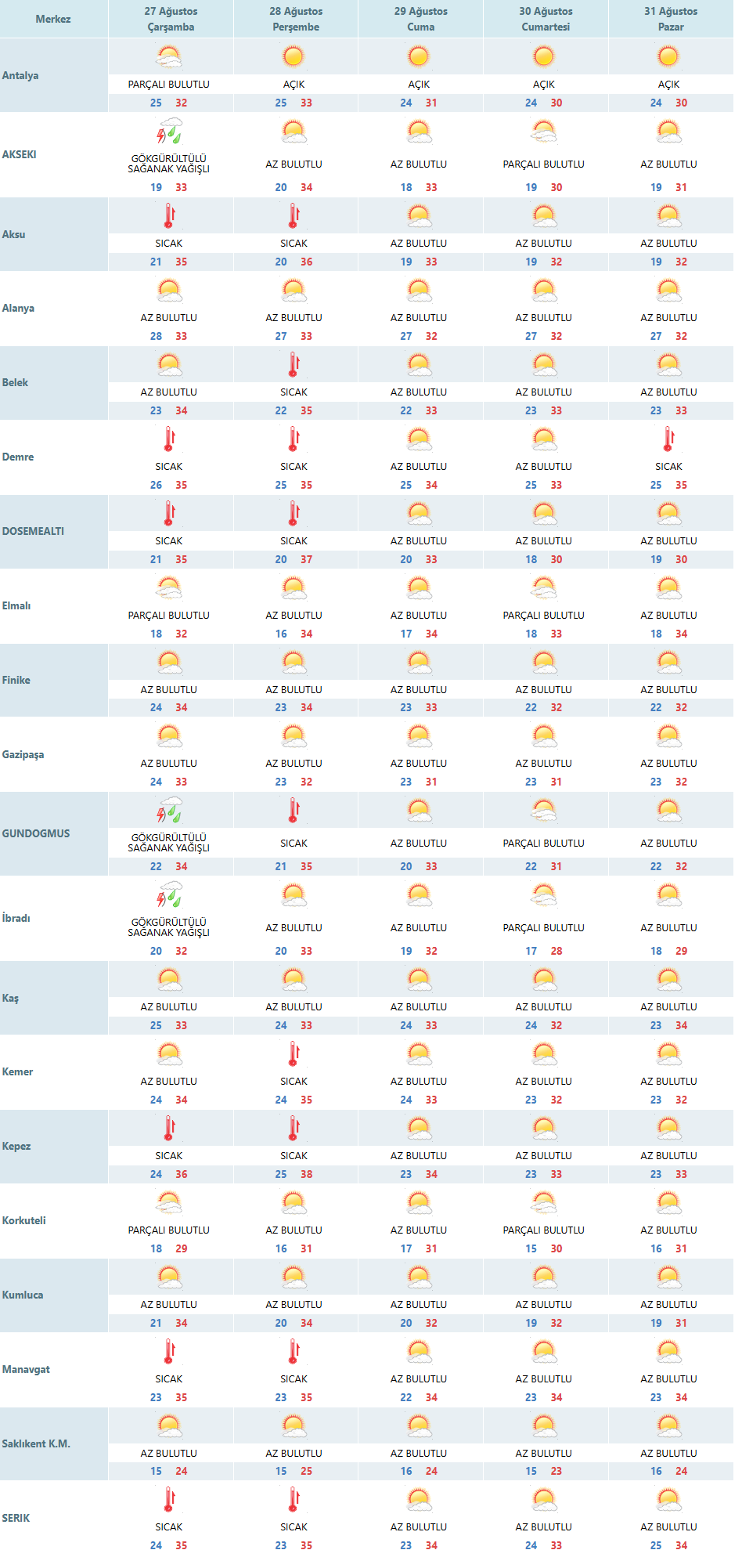 27 Ağustos Çarşamba günü Antalya genelinde hava sıcak ve güneşli geçecek. Sahil kesimlerinde yazın keyfi çıkarılabilirken, iç bölgelerde gökgürültülü sağanak yağış riski bulunuyor. Meteoroloji yetkilileri, yağış ihtimali olan ilçelerde açık alanlarda ve tarım faaliyetlerinde tedbirli olunmasını öneriyor.