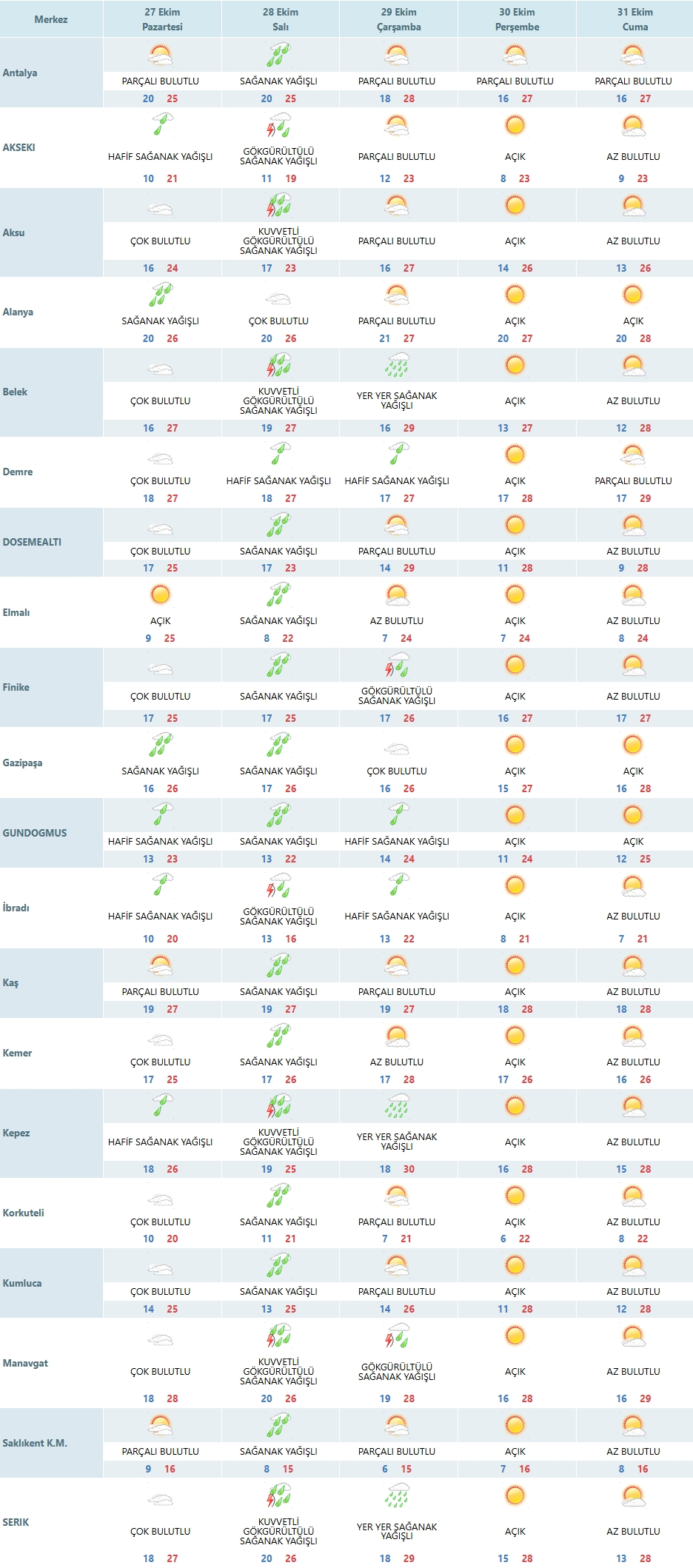 Haftanın ilk günü olan 27 Ekim Pazartesi, Antalya genelinde parçalı bulutlu bir hava bekleniyor. Meteoroloji verilerine göre kent merkezinde gündüz sıcaklığı 25 dereceye kadar çıkarken, gece saatlerinde 20 dereceye kadar düşecek. Yağış ihtimali düşük olsa da günün ilk saatlerinde yer yer bulut geçişleri görülebilir. Genel olarak sakin, ılık ve sonbahara yakışan bir hava kenti karşılayacak.