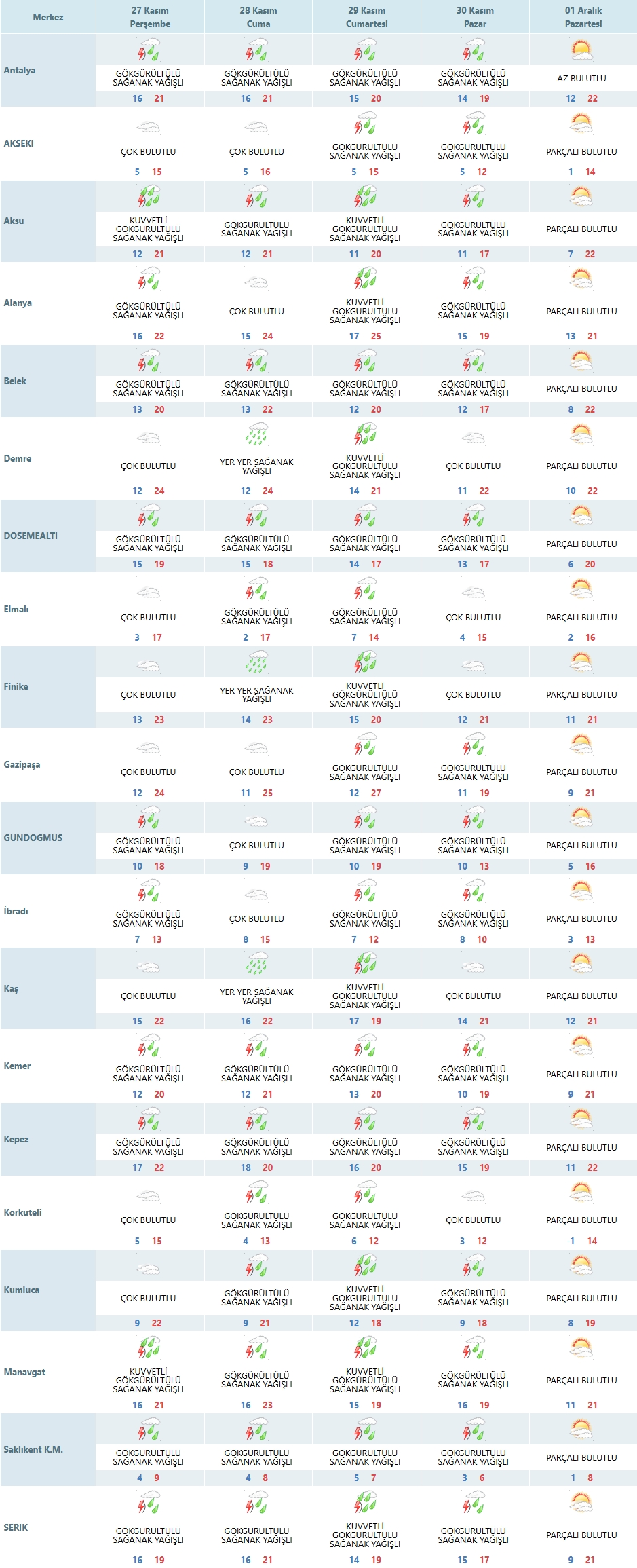Antalya merkezde 27 Kasım Perşembe günü gökgürültülü sağanak yağışı hâkim olacak. Günün en düşük sıcaklığı 16, en yüksek sıcaklığı ise 21 derece olacak. Kentin sahil kesiminde yer yer daha yoğun yağış geçişleri görülebilir. Turizm bölgelerinde planlanan açık hava etkinliklerinin yağıştan etkilenme ihtimali yüksek. Şehir içi trafikte ise yağışla birlikte görüş mesafesinin düşmesi bekleniyor.