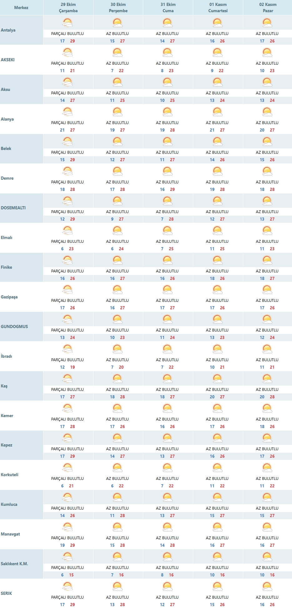 Antalya genelinde hava durumu merkezle paralel seyredecek. Alanya, Manavgat, Kemer ve Serik’te de gökyüzü parçalı bulutlu olacak. Bu ilçelerde sıcaklık 28-29 dereceye kadar çıkarken, gece saatlerinde termometreler 16-18 dereceye kadar inecek.