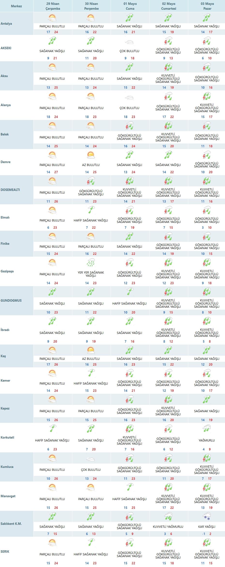 Antalya’nın sahil ilçelerinde genel tablo merkezle benzer. Alanya, Manavgat, Kemer ve Serik’te parçalı bulutlu hava hakim olacak, sıcaklıklar 24-26 derece bandında seyredecek. Bu bölgelerde gün içinde güneş zaman zaman kendini gösterecek.