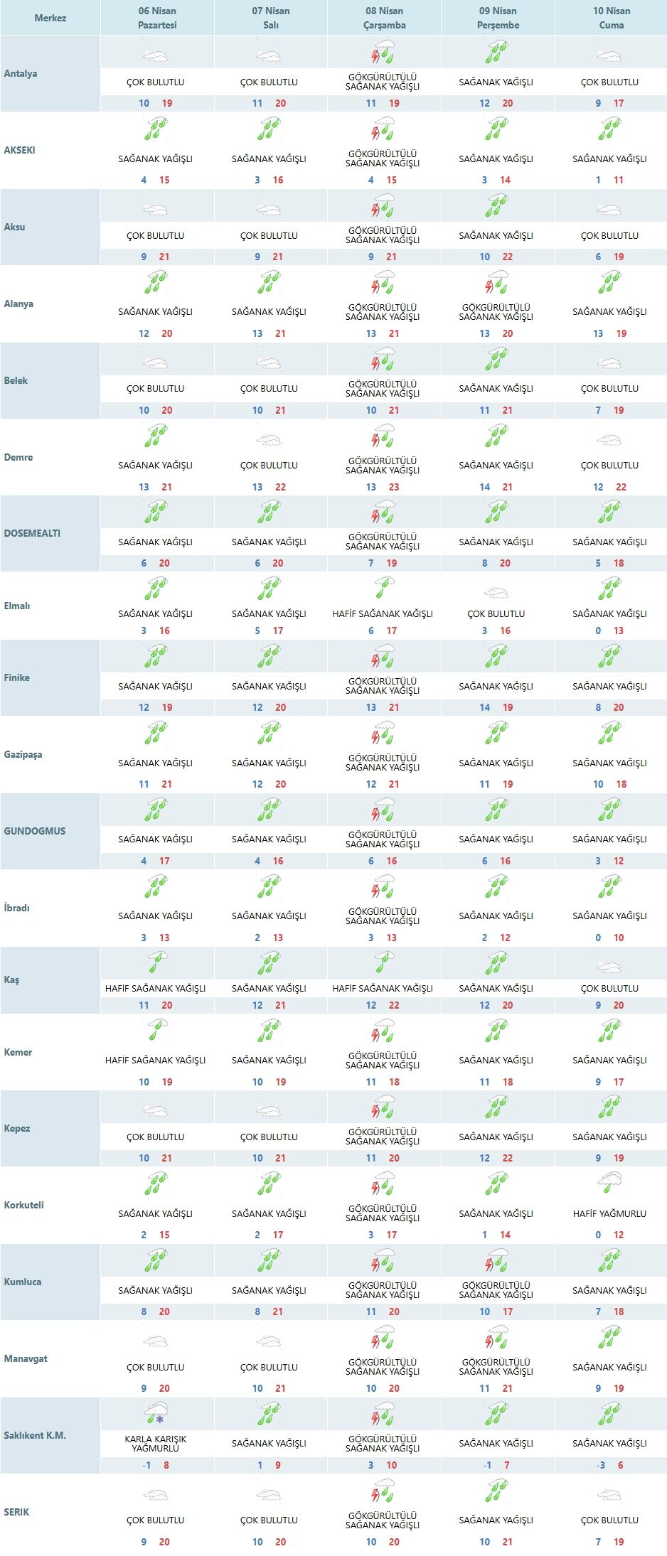 İç ve yüksek kesimlerde daha serin bir hava etkili oluyor. Elmalı’da sağanak yağışla birlikte sıcaklık 3 ila 16 derece arasında ölçülüyor. Korkuteli’nde ise değerler 2 ila 15 derece seviyesinde. Saklıkent Kayak Merkezi’nde ise dikkat çeken bir tablo var. Bölgede karla karışık yağmur beklenirken sıcaklık -1 ila 8 derece arasında seyrediyor. Bu durum yüksek rakımlı bölgelerde kış şartlarının etkisini sürdürdüğünü gösteriyor.