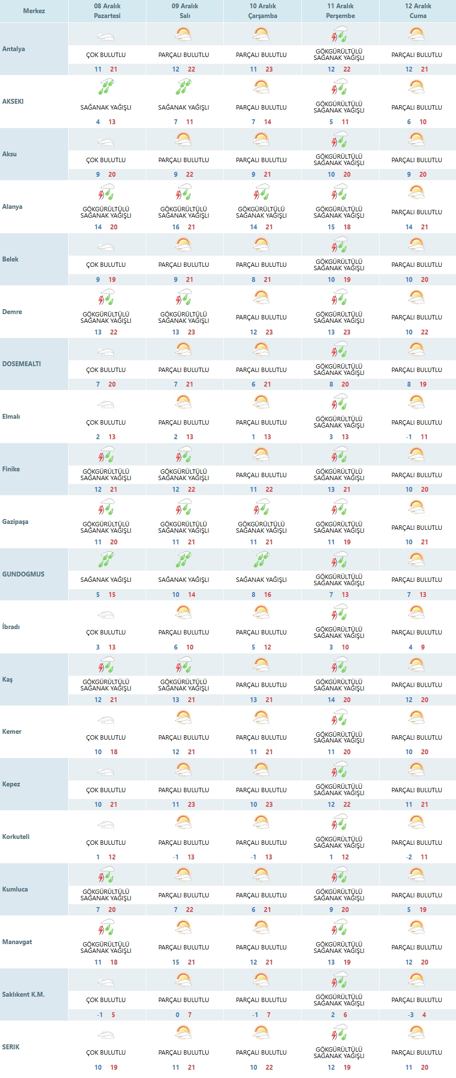 Görseldeki verilere göre sadece merkezde değil, pek çok ilçede de bulutlu hava hakim. Aksu, Kepez, Kemer gibi bölgelerde de 8 Aralık günü “çok bulutlu” ibaresi öne çıkıyor. Kıyı kesimlerinde sıcaklıklar 19-21 derece bandında seyrederken, iç kesimlere doğru gidildikçe değerler bir miktar daha düşüyor. Korkuteli ve Elmalı gibi yüksek kesimlerde gün içi sıcaklıklar 12-13 derecelerde kalıyor. Bu nedenle ilçeler arasında hissedilir bir sıcaklık farkı oluşuyor.