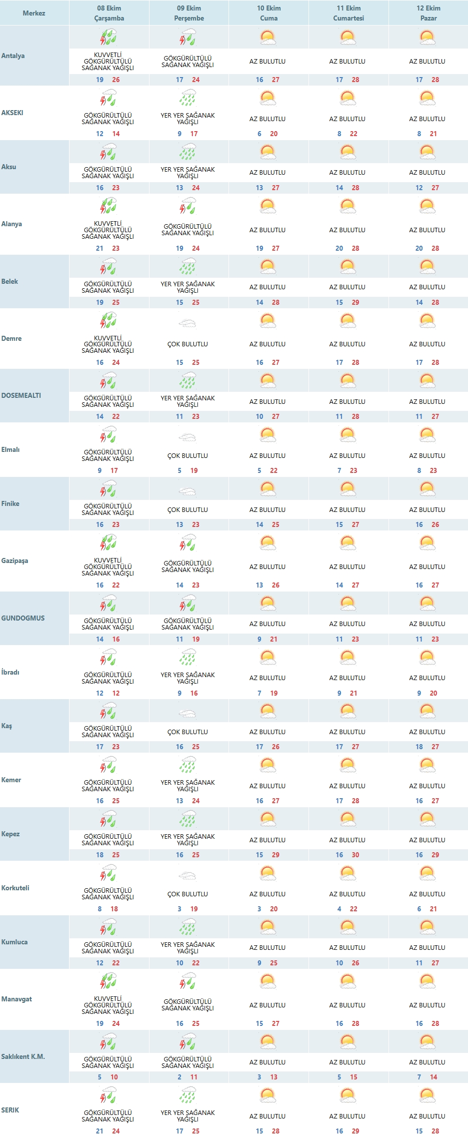 Meteoroloji Genel Müdürlüğü’nün tahminlerine göre Antalya, 8 Ekim Çarşamba günü kuvvetli gök gürültülü sağanak yağışın etkisi altına girecek. Kent genelinde sabah saatlerinden itibaren başlayan yağışların gün boyunca aralıklarla sürmesi bekleniyor. Hava sıcaklıkları ise gün içinde 19 dereceye kadar düşerken, en yüksek sıcaklık 26 derece civarında seyredecek.