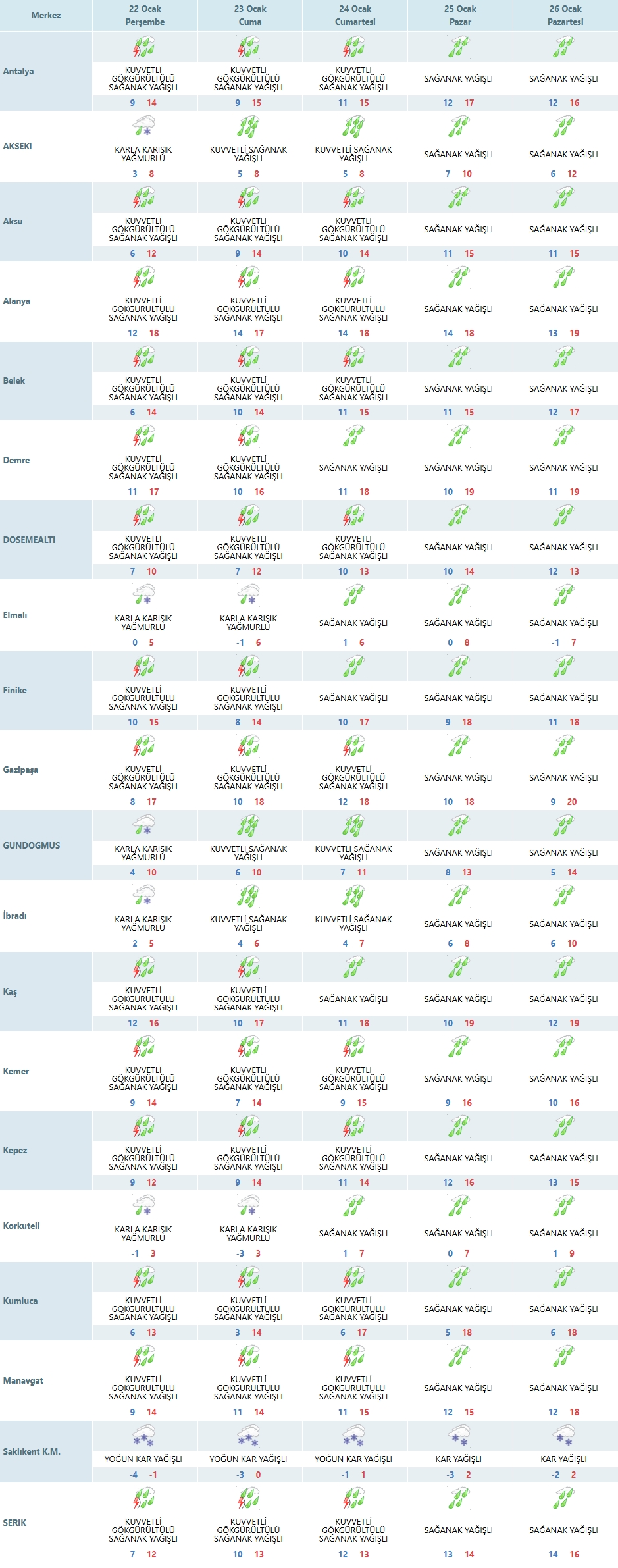 Elmalı, Akseki ve İbradı: Bu ilçelerde karla karışık yağmur ve kar yağışı etkili olacak. Özellikle Akseki'de sıcaklık 3 dereceye kadar düşecek.