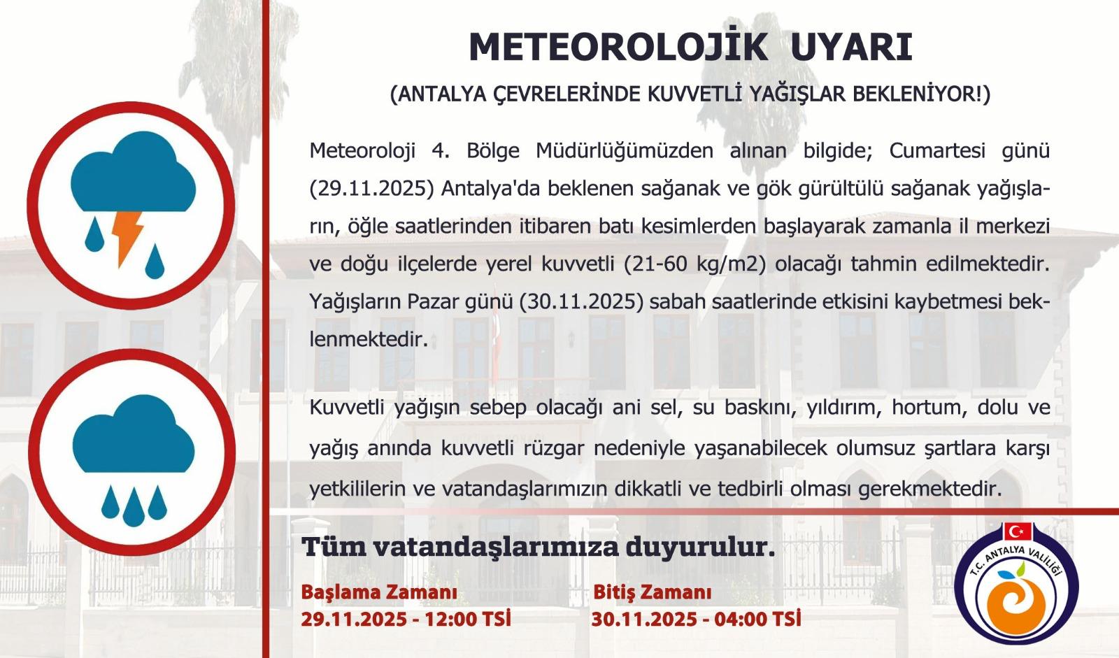 Yapılan açıklamaya göre, 29 Kasım Cumartesi günü öğle saatlerinden itibaren Antalya’nın batısından başlayacak yağışlar zamanla merkeze ve doğu ilçelerine doğru ilerleyecek. Yağışların yer yer 21–60 kg/m² aralığında kuvvetli olmasının beklendiği bildirildi.