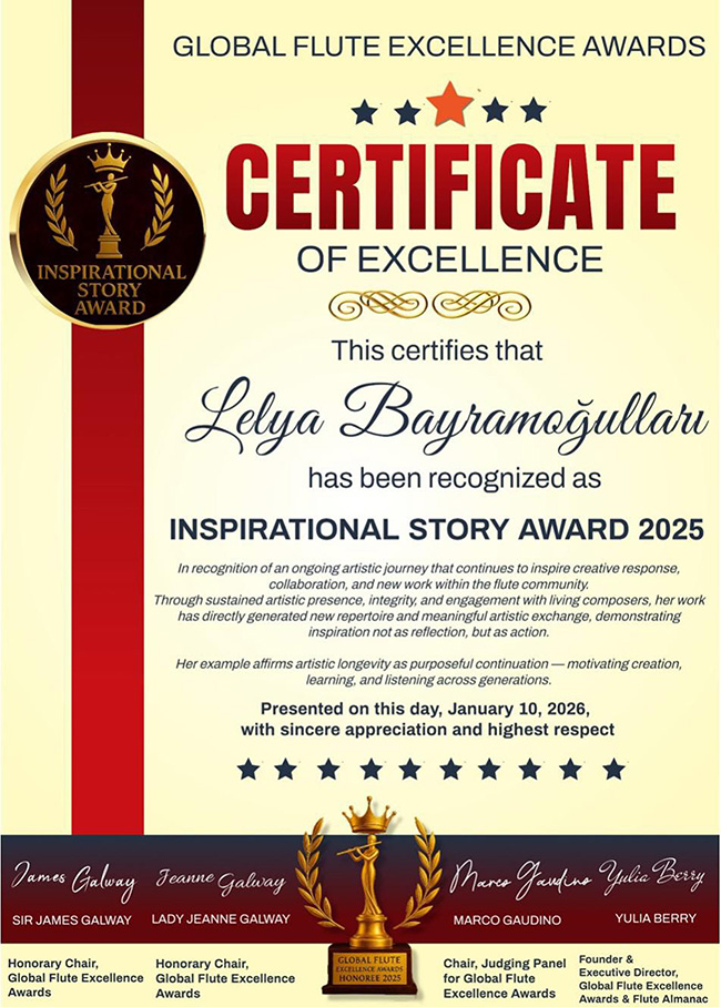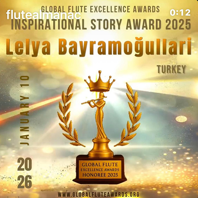 Bugüne kadar Özbekistan, Rusya, Brezilya, Yunanistan ve Belçika'dan tanınmış besteciler tarafından kendisine ithafen flüt eserleri yapılan Antalya Devlet Senfoni Orkestrası Flüt Sanatçısı Lelya Bayramoğulları, 2025 Küresel Flüt Mükemmeliyet Ödülleri (Flute Almanac Global Flute Excellence Awards) kapsamında 'İlham Veren Flüt Sanatçısı' kategorisinde ödül aldı.
