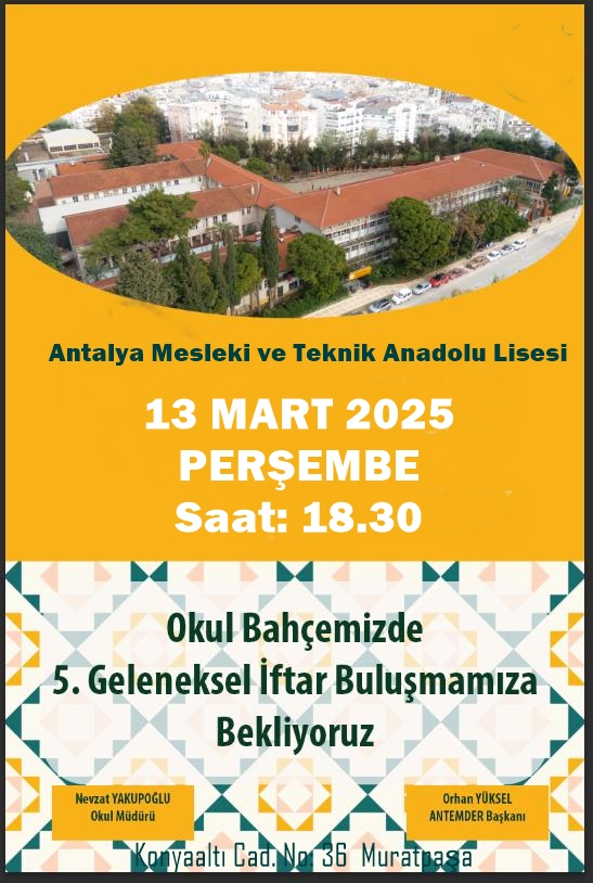 Bu yıl 5’incisi düzenlenecek olan geleneksel iftar daveti, 13 Mart Perşembe günü, Antalya Endüstri Meslek Lisesi'nin bahçesinde olacak. Muratpaşa Belediyesi'nin desteğiyle düzenlenen iftar programı, saat 18.30'da okul idaresi ve dernek yönetiminin açılışıyla başlayacak. İftar programı, yalnızca mezunlar için değil, eğitim gören öğrenciler ve tüm eğitim camiası için önemli bir buluşma noktası olacak. Dayanışma ve birlik ruhunu pekiştiren bu anlamlı etkinlik hem eski dostların yeniden bir araya gelmesine hem de farklı kuşakların kaynaşmasına olanak sağlayacak.