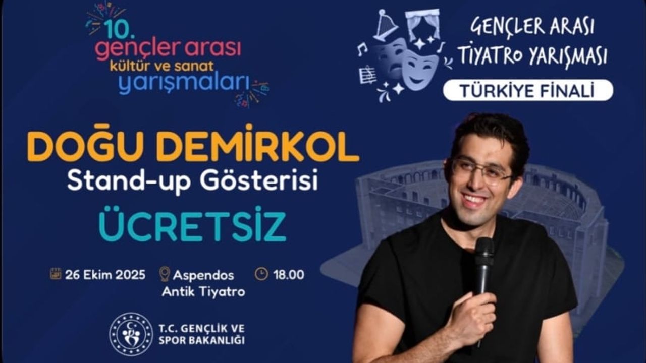 Antalya’nın tarihi atmosferinde sanat dolu bir akşam yaşanacak. Gençlik ve Spor Bakanlığı tarafından düzenlenen 10. Gençler Arası Kültür ve Sanat Yarışmaları kapsamında gerçekleştirilecek Tiyatro Türkiye Finali, bu yıl Aspendos Antik Tiyatro’da yapılacak. 26 Ekim Pazar günü saat 18.00’da başlayacak final programında, Türkiye’nin dört bir yanından gelen genç tiyatro ekipleri sahneye çıkarak performanslarını sergileyecek. Toplam 7 tiyatro oyununun yer alacağı etkinlikte, gençler hem yeteneklerini gösterecek hem de kültür-sanatın birleştirici gücüyle unutulmaz anlar yaşayacak. Tiyatro gösterilerinin ardından sahneye ünlü komedyen Doğu Demirkol çıkarak stand-up gösterisiyle izleyicilere kahkaha dolu dakikalar yaşatacak. Gecenin finalinde ise DJ performansı ve ışık şöleni Aspendos’un büyüleyici atmosferinde seyircilere görsel bir şölen sunacak. Binlerce yıllık tarihe tanıklık eden Aspendos Antik Tiyatro’da düzenlenecek bu özel etkinlik, genç sanatçılarla sanatseverleri bir araya getirerek kültürün ve eğlencenin kalbini bir kez daha Antalya’da attıracak. Organizatörler, tüm sanatseverleri ve gençleri bu eşsiz atmosferin parçası olmaya, “Sen de katıl, bu unutulmaz gecenin bir parçası ol!” diyerek davet ediyor.