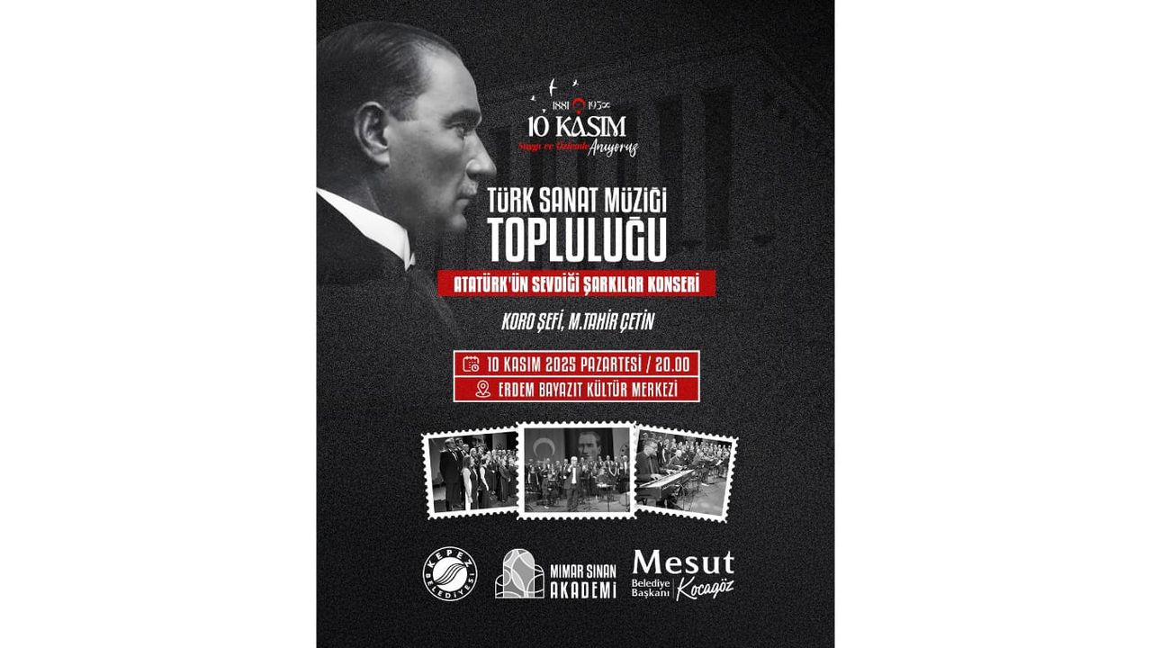 Kepez Belediyesi, 10 Kasım Atatürk’ü Anma Günü dolayısıyla özel bir konsere ev sahipliği yapacak. Mimar Sinan Akademi Türk Sanat Müziği Topluluğu, ‘Atatürk’ün Sevdiği Şarkılar Konseri’ ile büyük liderin en sevdiği eserleri seslendirecek. Koro şefliğini M. Tahir Çetin’in üstlendiği konser, 10 Kasım Pazartesi günü saat 20.00’da Erdem Bayazıt Kültür Merkezi’nde gerçekleştirilecek. Etkinlikte Atatürk’ün en çok dinlediği Türk Sanat Müziği eserleri seslendirilecek. Katılımcılar hem Türkiye Cumhuriyeti’nin kurucusunu anacak, hem de onun sanat ve müziğe olan sevgisini paylaşacak.