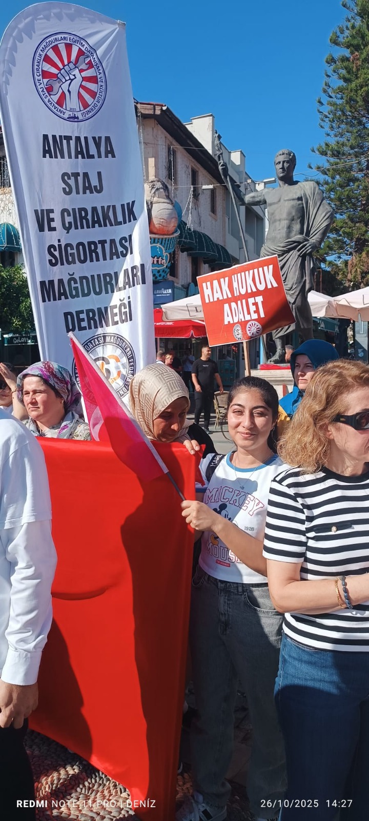 Antalya Staj ve Çıraklık Mağdurları haklarını aramak için mücadelesini sürdürüyor. Bir kez daha Attalos’ta bir araya gelen mağdurlar seslerini duyurmak için basın açıklaması düzenledi. “Bugün burada yıllardır içimizde büyüyen bir adaletsizliği dile getirmek, hakkımızı aramak için toplandık” diyen Antalya Staj ve Çıraklık Sigortası Mağdurları Derneği Başkanı Resul Günay, şöyle konuştu: “Bizler; çocuk yaşta tezgah başında, sanayide, atölyede alın teri döken, ama o yılların sigortası sayılmadığı için bugün emekliliği elinden alınmış milyonlarız. Kimimiz 15 yaşında işe başladı, kimimiz 16’sında ailesinin yükünü omuzladı. Sabah ezanında iş başı yaptık, akşam karanlığında eve döndük ama bugün bize deniliyor ki, ‘O günler sayılmaz.’ Bizim alın terimiz neden sayılmıyor? Bizim emeğimiz neden yok sayılıyor? Biz kimseye ayrıcalık değil, sadece adalet istiyoruz.”
