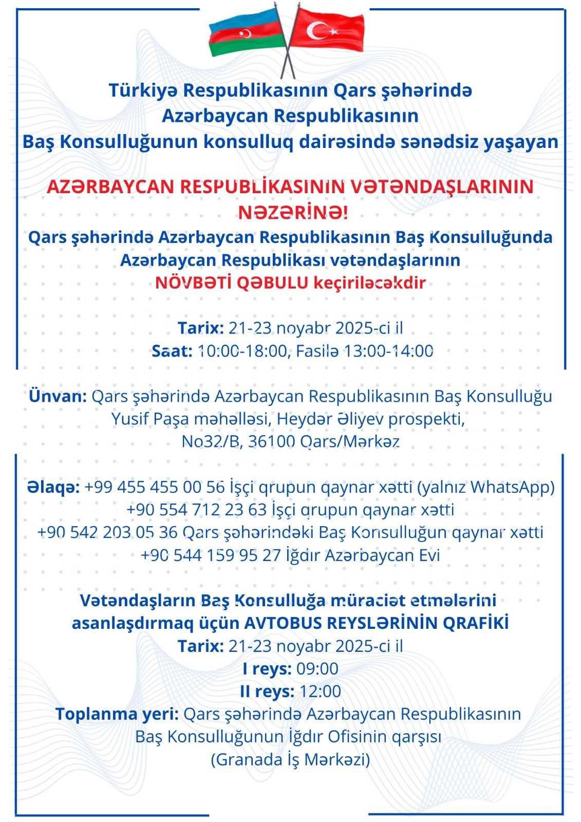 Azerbaycan Cumhuriyeti Hükümeti tarafından onaylanan ilgili Eylem Planının uygulanması amacıyla, ilgili devlet kurumlarının temsilcilerinden oluşan bir Çalışma Grubu, Kars şehrine ziyaret gerçekleştirecek. Çalışma Grubu tarafından 21-23 Kasım 2025 tarihleri arasında, Türkiye Cumhuriyeti’nin Kars şehrinde bulunan Azerbaycan Cumhuriyeti Başkonsolosluğunun konsolosluk bölgesine dahil olan yerleşim bölgelerinde (Ağrı, Ardahan, Adıyaman, Artvin, Batman, Bayburt, Bitlis, Bingöl, Diyarbakır, Erzurum, Elazığ, Erzincan, Hakkari, Iğdır, Kars, Malatya, Mardin, Muş, Rize, Tunceli, Trabzon, Van, Giresun, Gümüşhane, Ordu, Siirt, Şırnak, Şanlıurfa) belgesiz yaşayan Azerbaycan vatandaşlarının kabulü gerçekleştirilecek.