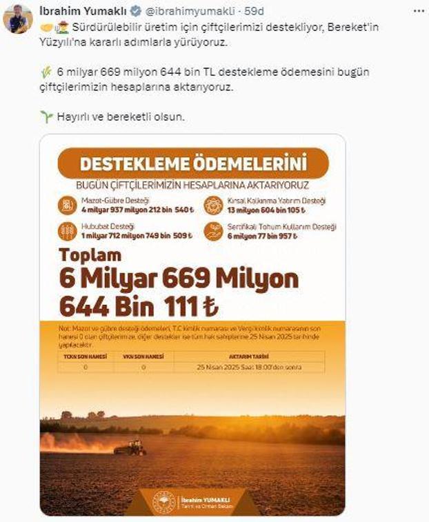 Tarım ve Orman Bakanı İbrahim Yumaklı, sosyal medya hesabından yaptığı açıklamada, tarımsal destekleme ödemelerinin bugün itibarıyla çiftçilerin hesaplarına aktarılacağını duyurdu. Buna göre; toplam 6 milyar 669 milyon 644 bin TL tutarındaki destek ödemeleri kapsamında mazot-gübre desteği 4 milyar 937 milyon 212 bin 540 TL, kırsal kalkınma yatırım desteği 13 milyon 604 bin 105 TL, hububat desteği 1 milyar 712 milyon 749 bin 509 TL, sertifikalı tohum kullanım desteği 6 milyon 77 bin 957 TL çiftçilerin hesaplarına aktarılacak.