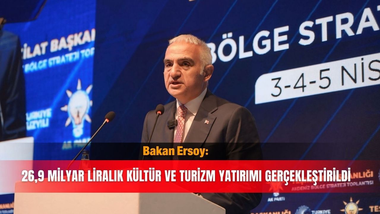 Akdeniz Bölgesi'nde 2002-2025 yılları arasında yaklaşık 26,9 milyar liralık kültür ve turizm yatırımı gerçekleştirildiğini belirten Ersoy, aynı dönemde yerel yönetimlerin turizm altyapı projelerine aktarılan kaynağın yaklaşık 21,1 milyar liraya ulaştığını söyledi. Bölgede konaklama kapasitesindeki artışa da işaret eden Ersoy, '2002'de 610 konaklama tesisi varken neredeyse altı buçuk katlık bir artışla bugün 3 bin 845 konaklama tesisimiz misafirlerini ağırlamaktadır. Yatak kapasitesi 2002'de 161 bin 970 kişi iken 2026 mart ayı itibarıyla 684 bin 681 kişiye ulaşmış bulunuyoruz. Burada da 4 katından fazla bir artış yakalamış durumdayız' dedi.