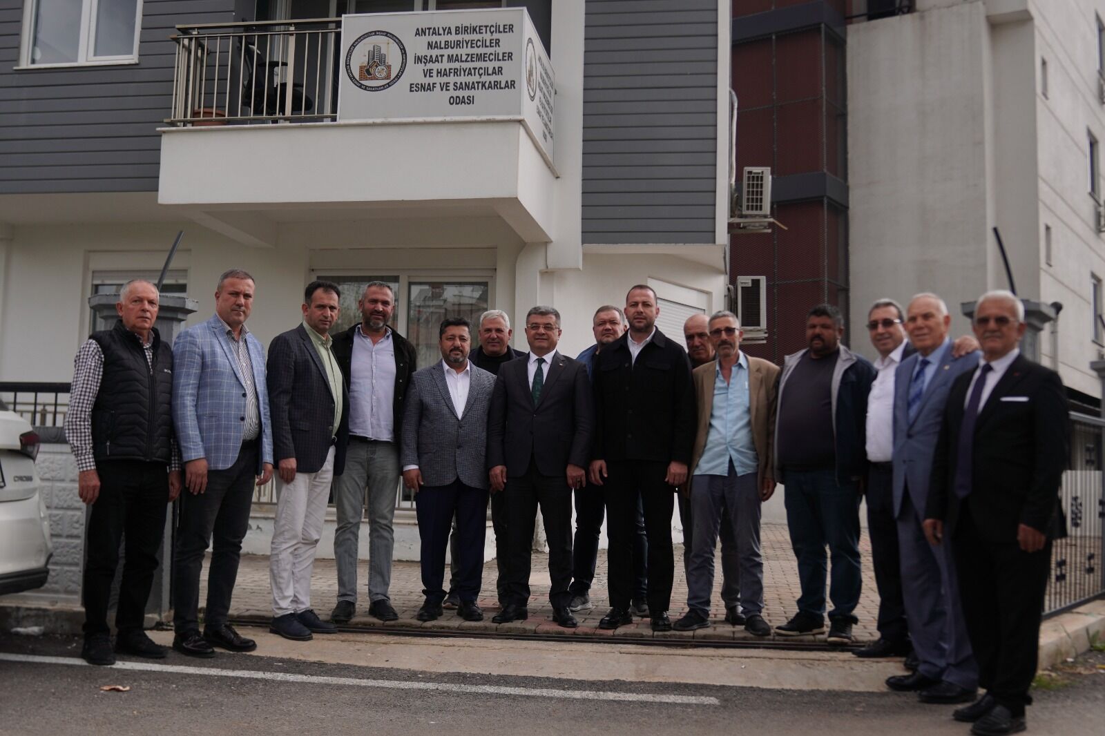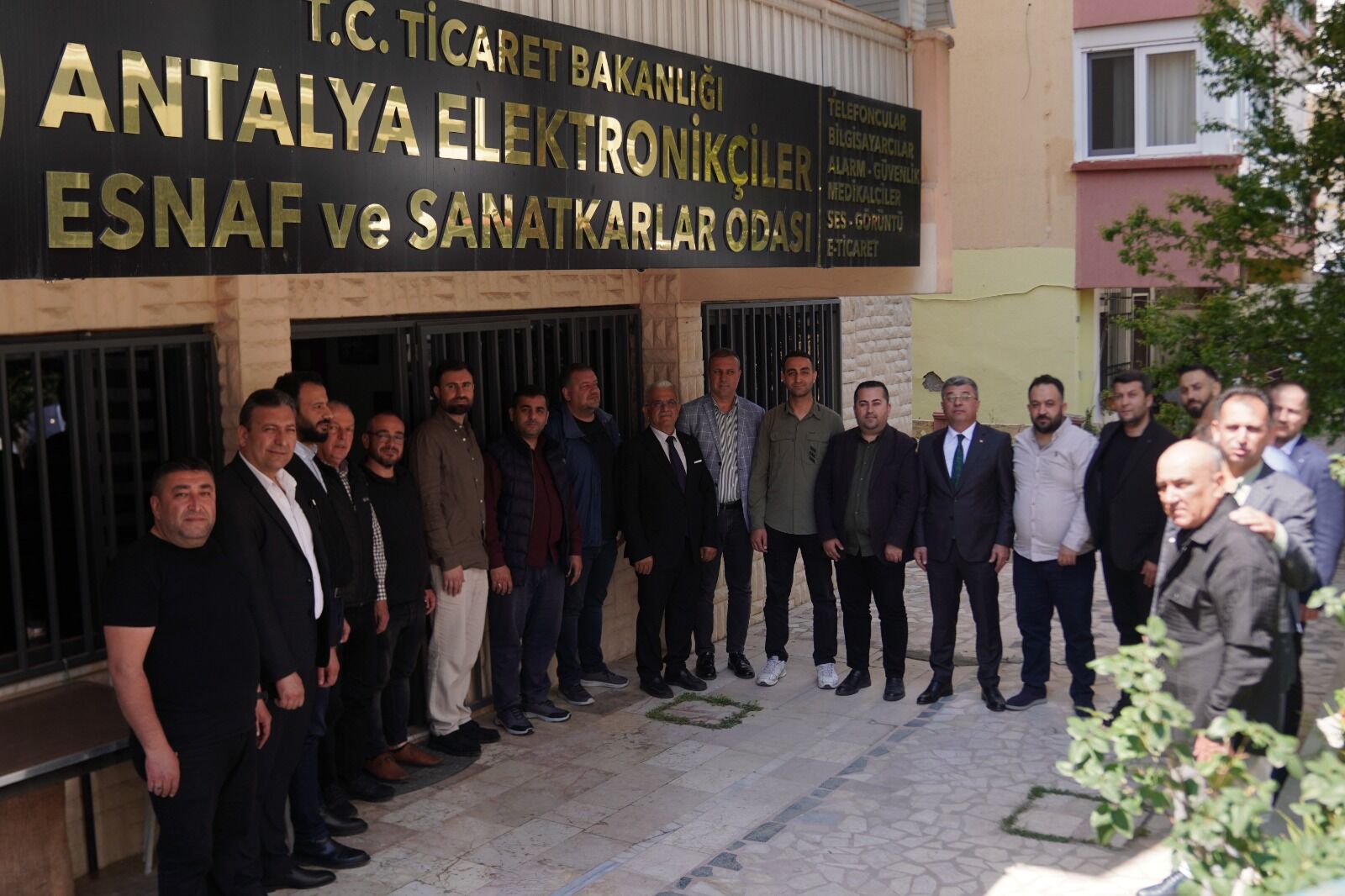 Antalya Elektronikçiler, Radyo TV Tamircileri ve Malzeme Satıcıları Esnaf Odası Başkanı Harun Önal, Antalya Kahveciler Odası Başkanı Aşur Boydak, Antalya Kasaplar Odası Başkanı Osman Yardımcı, Antalya Biriketçiler, Nalburiyeciler, İnşaat Malzemeleri ve Hafriyatçılar Esnaf ve Sanatkârlar Odası Başkanı Halil Efe Çevik, Antalya Tuhafiyeciler Mefruşatçılar Züccaciyeciler ve Hediyelik Eşya Satıcıları Esnaf Odası Başkanı Mustafa Aksoy ve oda yönetimlerini ziyaret eden Başkan Alkan’ın heyetinde: