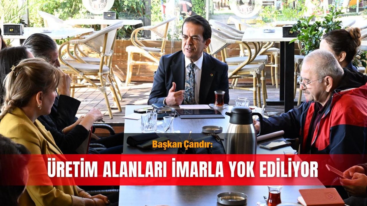 Çandır, “Zorlanırken mevcut tarım arazilerimiz de risk altında. Şehrin yapılanması yatay devam ediyor. Altınova eskiden tamamen üretim bölgesiydi. Serik üretim bölgesiydi. Şimdi artık imarla inşaatlar seraları, üretim alanlarını yok ediyor. Antalya özelinde söylemek gerekirse uzunca bir süredir Antalya suyun akışına giden bir şehir niteliğinde, kendiliğinden, işte doğal güzellikleriyle, iş dünyasının becerisiyle, kamunun aktifliğiyle bir suyun akışında yol bulmaya çalışıyor. Genel anlamda biz eskiden krizlerde hep Antalya olarak Türkiye küçülürken hep büyüyerek çıkmıştık. Çünkü dışa açık, ihracat yapan, turist ağırlayan bir ildik. Son iki dönemdir kurdaki baskıdan kaynaklı bu özelliğimiz de kayboldu. Antalya'nın aslında yeniden yapılanmaya ihtiyacı var" diye konuştu.