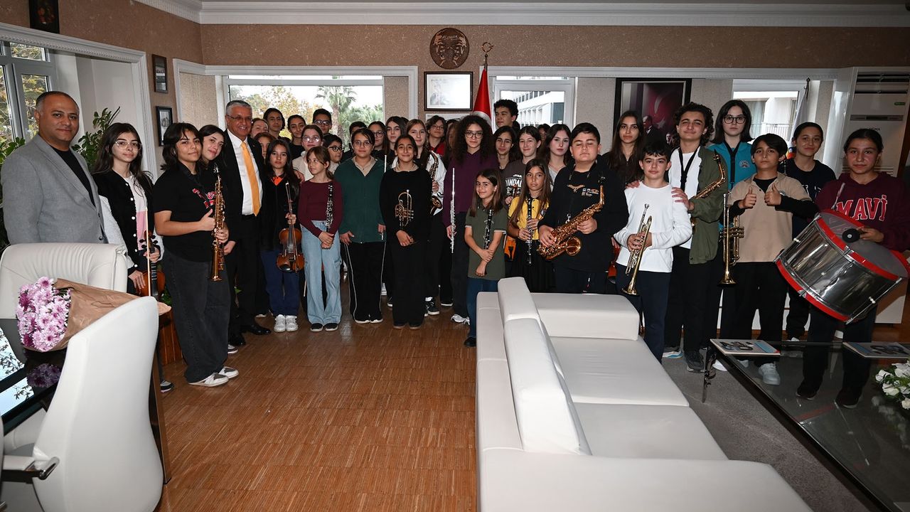 Kemer Belediyesi ATSO Eğitim ve Sanat Merkezi'nde ücretsiz müzik eğitimi alan Kemer Belediyesi Gençlik Orkestrası öğrencileri, Orkestra Şefi Furkan Üstündağ ile Öğretmenler Günü dolayısıyla Kemer Belediye Başkanı Necati Topaloğlu'nu ziyaret ederek gününü kutladı