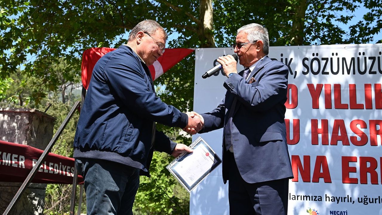 2012 yılında Göynük Belediye Başkanlığı yaptığına değinen Başkan Topaloğlu, 'Daha önce Beldibi Konyaaltı Belediyesi'ne bağlandı. 2012'de tekrar Kemer'e dönüp Göynük'e bağlandığında buralar imar planında tarım alanıydı. Kültür ve Turizm Bakanlığı ile görüştük ve bize tarım dışı kullanım diye bir rapor çıkar dediler. Üniversiteden tarım raporu çıkardık. Bakanlık kamu yararı kararı aldı ve 1000'lik ve 5000'lik planları onayladı. 2014 yılında Büyükşehir Yasası ile Göynük Belediyesi kapanınca Kemer Belediyesi'ne kaldı. 2014 - 2019 yılları arasında aday olmadık. 2019 seçimlerinde sizlerin oylarıyla göreve geldiğimizde Beldibi bıraktığımız gibi duruyordu ve planlarda bir ilerleme yoktu. Tekrar 18 uygulamasına geçildi. Bu konuda bizden desteklerini esirgemeyen Tapu Kadastro Bölge Müdürü, Tapu Kadastro İl Müdürü, Kemer Tapu Müdürü ve Kemer Belediye Başkan Yardımcımız Gülsüm Bal ve ekibine çok teşekkür ediyorum. Tam yedi yıl uğraştılar. Beldibi 3'den arıtmaya kadar olan yerlerin tapularını bitirdik. Büyükşehir ve kadastrodan geçti ve tapuya geldi. Sonuçta artık tüm süreç tamamlandı ve Beldibi 3'ten ilkokulun oraya kadar olan bölgenin tüm tapularını dağıtıyoruz' diye konuştu.