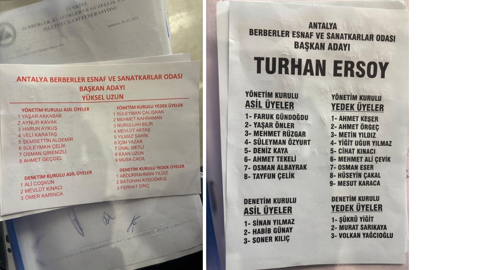 Antalya Berberler Esnaf ve Sanatkarlar Odası’nın Konyaaltı Nazım Hikmet Kültür Merkezi’nde gerçekleştirilen genel kurulunda mevcut başkan Yüksel Uzun beyaz listeyle yarışırken, Turhan Ersoy ise mavi listeyle yarıştı. Yoğun katılımın olduğu genel kurulda 747 oy alan Yüksel Uzun yeniden başkan seçilirken, Turhan Ersoy 496 oyda kaldı.