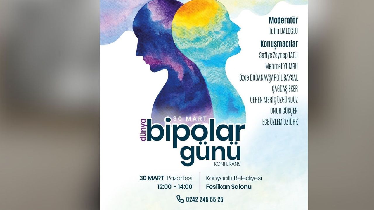 Konyaaltı Belediyesi, halk sağlığına dikkat çekmek amacıyla farkındalık etkinlikleri düzenlemeye devam ediyor. Konyaaltı Belediyesi’nden yapılan duyuruya göre, 30 Mart Dünya Bipolar Günü dolayısıyla bir konferans düzenlenecek. Konyaaltı Belediyesi, Türkiye Psikiyatri Derneği, Bipolar Bozukluklar Derneği ve Lityum Derneği’nin iş birliğinde gerçekleşecek konferansın moderatörlüğünü Tülin Daloğlu yapacak. Konferans, 30 Mart Pazartesi günü 12:00 ile 14:00 saatleri arasında Konyaaltı Belediyesi Ana Hizmet Binası içerisinde yer alan Feslikan Salonu’nda vatandaşlarla buluşacak. Katılımın ücretsiz olacağı açıklanan konferans için detaylı bilgi 0242 245 55 25 numaralı hattan alınabilecek.