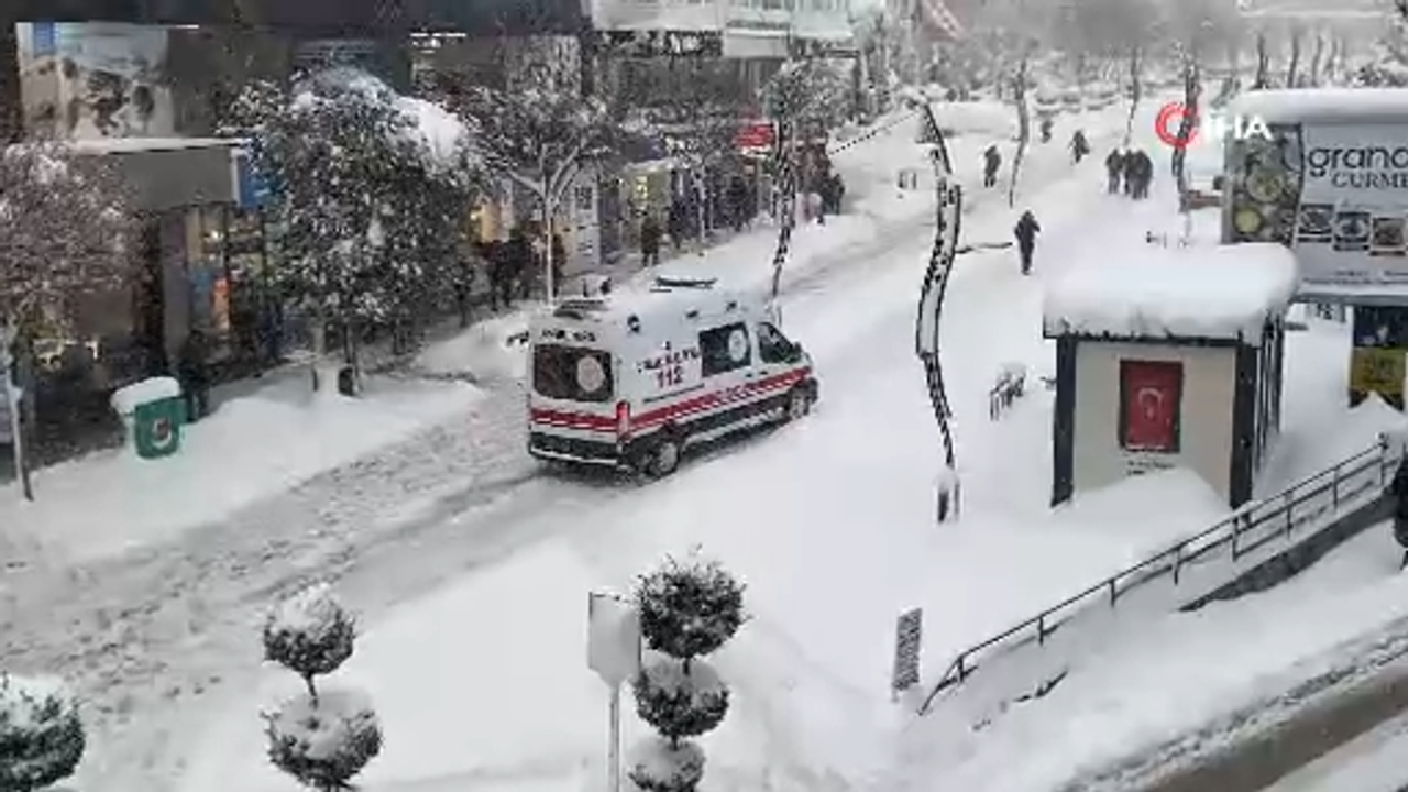 Bolu’da günlerdir etkisini sürdüren ve hayatı olumsuz etkileyen yoğun kar yağışı, ulaşımda aksamalara neden oluyor. Gece gündüz aralıksız yağan karla birlikte şehir merkezinde kar kalınlığı 50 santimetre olarak ölçüldü. Akşam saatlerinde kentin en işlek noktalarından biri olan İzzet Baysal Caddesi üzerinde seyir halinde olan 112 Acil Sağlık ambulansı, karla kaplı zeminde ilerlemekte zorlandı.
