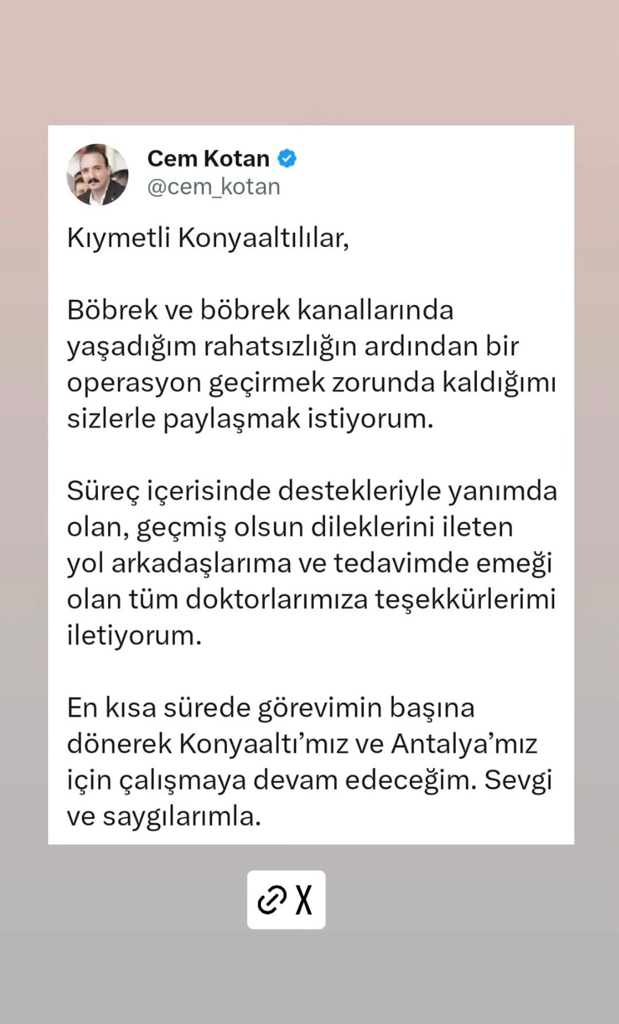 Konyaaltı Belediye Başkanı Cem Kotan, böbreklerinden yaşadığı rahatsızlık nedeniyle operasyon geçirdiğini ve sağlığına kavuşur kavuşmaz görevinin başına döneceğini belirtti. Kotan, sosyal medya hesabından yaptığı açıklamada şu ifadelere yer verdi: “Kıymetli Konyaaltılılar, böbrek ve böbrek kanallarında yaşadığım rahatsızlığın ardından bir operasyon geçirmek zorunda kaldığımı sizlerle paylaşmak istiyorum. Süreç içerisinde destekleriyle yanımda olan, geçmiş olsun dileklerini ileten yol arkadaşlarıma ve tedavimde emeği olan tüm doktorlarımıza teşekkürlerimi iletiyorum. En kısa sürede görevimin başına dönerek Konyaaltı’mız ve Antalya’mız için çalışmaya devam edeceğim. Sevgi ve saygılarımla.”
