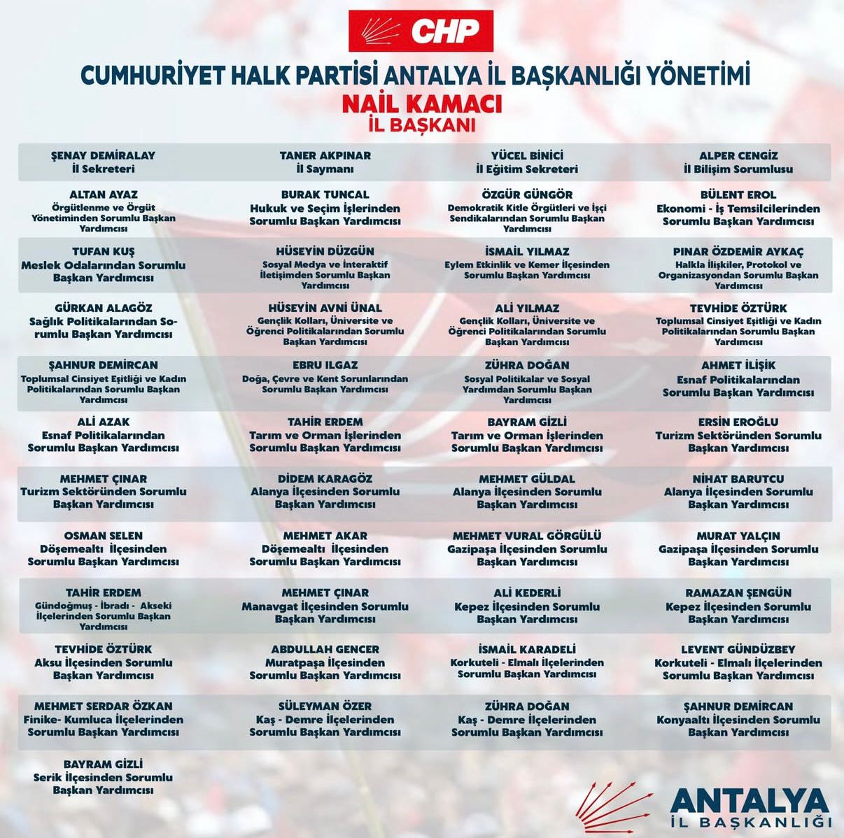 İl Başkanlığı görevini Nail Kamacı’nın yürüttüğü CHP Antalya İl Yönetimi şöyle: