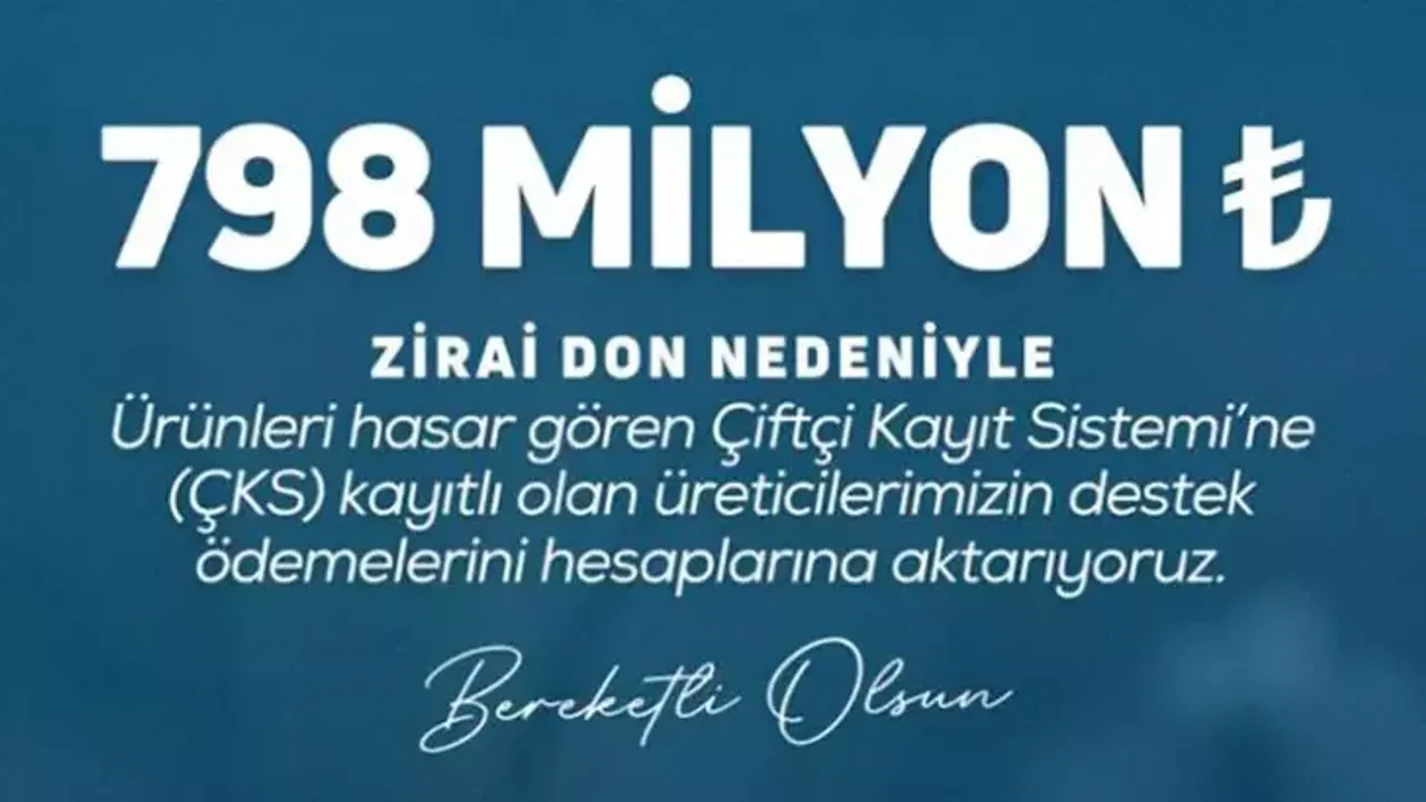 Bakan Yumaklı, sosyal medya hesabından yaptığı açıklamada, "Zirai don nedeniyle ürünleri hasar gören Çiftçi Kayıt Sistemi'ne (ÇKS) kayıtlı olan üreticilerimize önceki ödemelerin devamı olarak 798 milyon TL destek ödemesini de çiftçilerimizin hesaplarına aktarıyoruz. Böylece toplamda 22 milyar 946 milyon TL zirai don desteği üreticilerimizin hesaplarına aktarılmış oldu. Zirai don kapsamında üreticilerimize destek ödemelerine devam edeceğiz" ifadelerini kullandı.