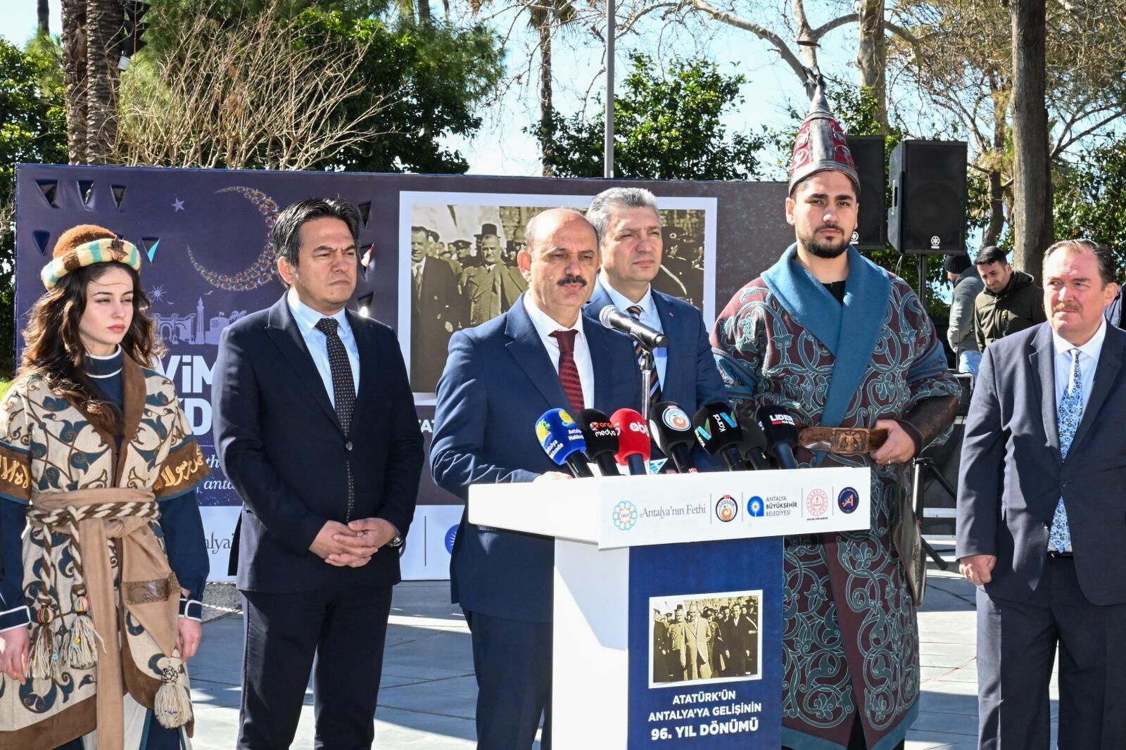 Antalya'nın fethinin 819’uncu yıl dönümü ve Gazi Mustafa Kemal Atatürk’ün Antalya’ya gelişinin 96’ıncı yıl dönümü dolayısıyla Antalya Valisi Hulusi Şahin başkanlığında basın toplantısı düzenlendi. Yavuz Özcan Parkı 1. Gıyaseddin Keyhüsrev heykeli önünde düzenlenen toplantıya Vali Hulusi Şahin, Antalya Büyükşehir Belediyesi Genel Sekreter Yardımcısı Cemil Böcek, Muratpaşa Kaymakamı İhsan Kara, Akdeniz Üniversitesi Rektör Yardımcısı Şükrü Özen, ilgili kurum müdürleri ve basın mensupları katıldı. Kutlama programı ve etkinliklere ilişkin açıklamalarda bulunan Vali Hulusi Şahin, “Üniversite, Büyükşehir ve diğer paydaşlarımızla birlikte 5 Mart’ta Antalya’nın fethinin 819’uncu yıl dönümünü, 6 Mart’ta ise Atatürk’ün Antalya’ya gelişinin 96’ıncı yıl dönümünü coşkuyla kutlayacağız” dedi.