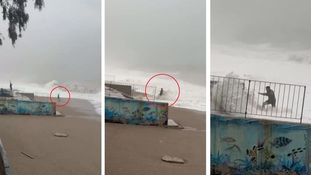 Meteoroloji 4. Bölge Müdürlüğü'nün Sarı Kod ile uyardığı Antalya'da şiddetli rüzgar etkisiyle denizde oluşan dev dalgalar, Konyaaltı Sahili'ni dövdü. Deniz suyu bazı noktalarda sahil bandına kadar ulaştı. Yağışa aldırış etmeyen bazı vatandaşlar Konyaaltı Sahili'nde denizi ve oluşan dalgaları izledi. Kimi vatandaşlar sahil bandına vuran dalgaları cep telefonu kamerası ile kayda aldı. Konyaaltı Sahili’nde zaman zaman yüksekliği 2 metreyi aşan dalgaların arasında video çekmek isteyen bir vatandaş ise zor anlar yaşadı. Paçalarını sıvayarak sahile inen vatandaş, bir anda üzerine doğru gelen kuvvetli dalgayı görünce panikle koşmaya başladı. O anlar bir başka vatandaşın cep telefonu kamerasına yansırken, sahile inen vatandaş ise dalgaların arasında kalmaktan kıyıdaki bir merdivene tutunarak son anda kurtuldu.