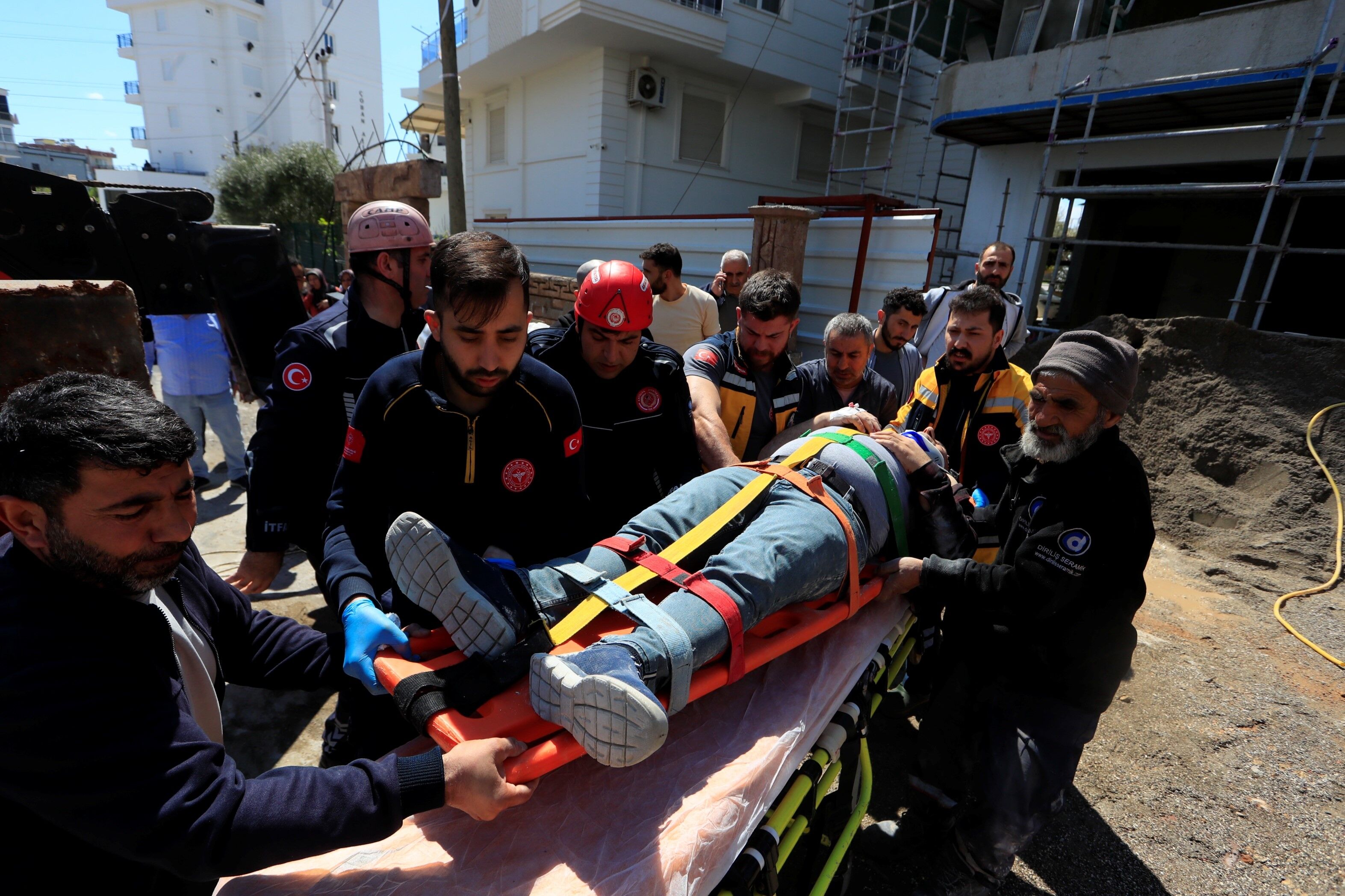 İnşaatta merdiven bulunmaması nedeniyle mesai arkadaşları yaralı işçiyi aşağıya indiremeyince olay yerine itfaiye, sağlık ve polis ekipleri sevk edildi. Verilen adrese gelen sağlık ve itfaiye ekipleri Maşallah E.'ye ilk müdahaleyi olay yerinde yaptı. Yaralı işçiyi bulunduğu yerden indirmek için çalışma başlatan itfaiye ekipleri Maşallah E.'yi ilk olarak kaşık sedyeye sabitledi. Olay yerine çağrılan vinç yardımıyla bulunduğu yerden indirilen ve vücudunun çeşitli yerlerinde kırıklar olduğu öğrenilen yaralı işçi sağlık ekipleri tarafından ambulansa alınarak Kepez Devlet Hastanesi'ne kaldırıldı.