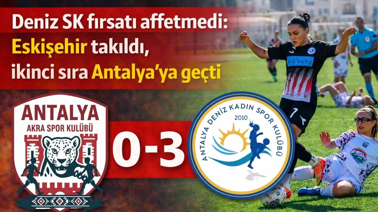 TFF Kadınlar 2. Ligi’nin 13’üncü haftasında Antalya futbolunun iki temsilcisi Antalya Akra Spor Kulübü ile Antalya Deniz Kadın Spor Kulübü, Zeytinköy 3 Nolu Saha’da karşı karşıya geldi. Antalya İl Hakemi Okan Deniz Kılıçcı’nın yönettiği mücadelede oyuna daha organize ve istekli başlayan taraf Deniz SK oldu. İlk dakikalardan itibaren rakip yarı sahada baskı kuran konuk ekip, özellikle kanat organizasyonları ve hızlı pas trafiğiyle Akra savunmasını zorladı. Bu baskının karşılığını 32’nci dakikada Merve Çakmak ile alan Deniz SK, golün ardından da temposunu düşürmedi. 37’nci dakikada bir kez daha sahneye çıkan Merve Çakmak, kendisinin ve takımının ikinci golünü kaydederek farkı ikiye çıkardı. İlk yarının kalan bölümünde oyunun kontrolünü bırakmayan Deniz SK, savunmada hata yapmayarak soyunma odasına 2-0’lık net bir üstünlükle girdi.