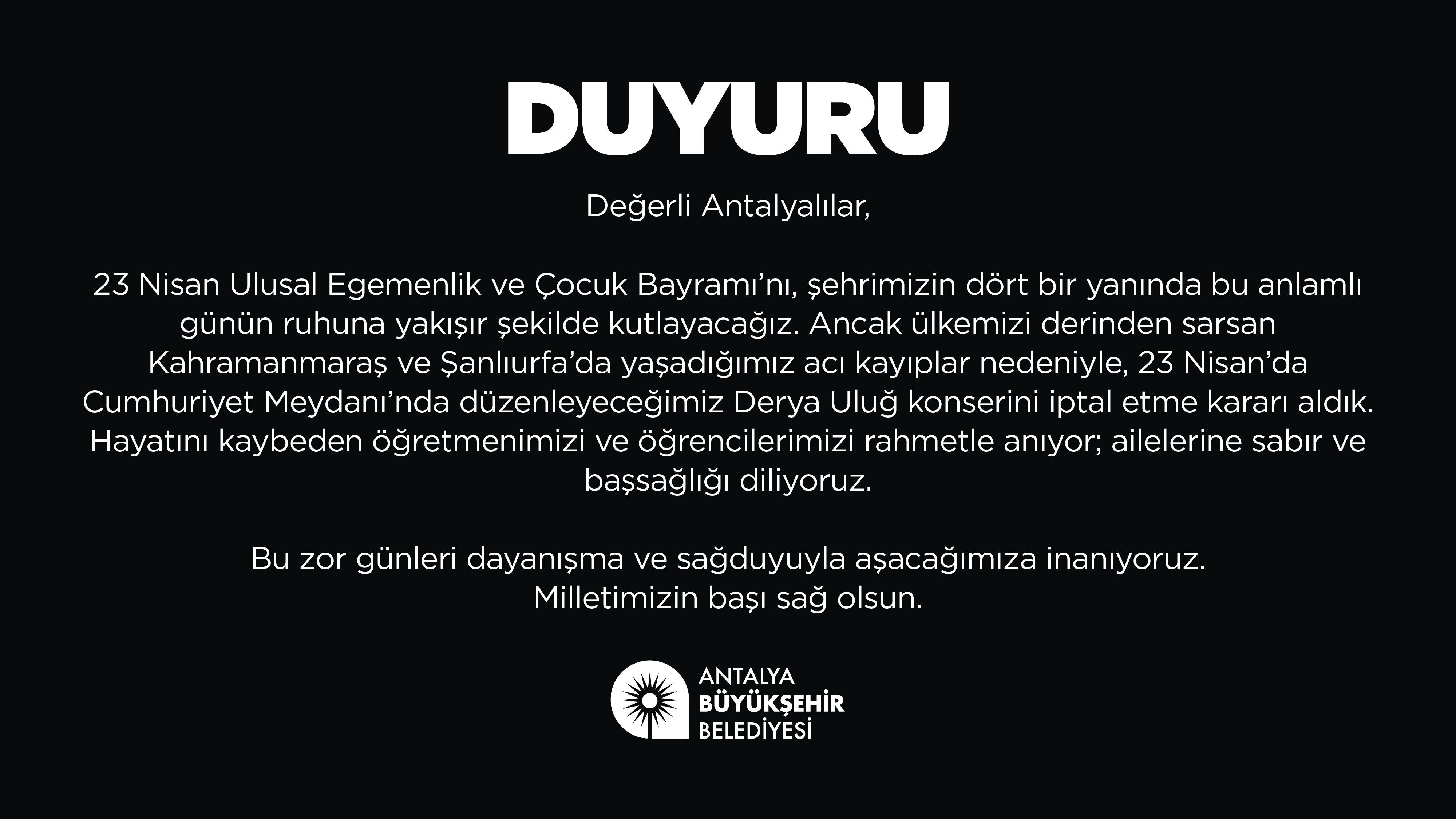 İptal kararı ile ilgili açıklamada, "23 Nisan Ulusal Egemenlik ve Çocuk Bayramı'nı, şehrimizin dört bir yanında bu anlamlı günün ruhuna yakışır şekilde kutlayacağız. Ancak ülkemizi derinden sarsan Kahramanmaraş ve Şanlıurfa'da yaşadığımız acı kayıplar nedeniyle, 23 Nisan'da Cumhuriyet Meydanı'nda düzenleyeceğimiz Derya Uluğ konserini iptal etme kararı aldık. Hayatını kaybeden öğretmenimizi ve öğrencilerimizi rahmetle anıyor; ailelerine sabır ve başsağlığı diliyoruz. Bu zor günleri dayanışma ve sağduyuyla aşacağımıza inanıyoruz. Milletimizin başı sağ olsun" denildi.