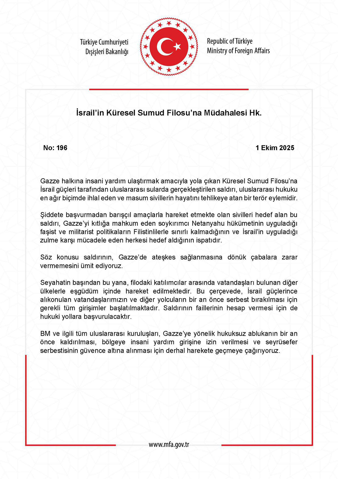 Bakanlık, Birleşmiş Milletler ve uluslararası kuruluşlara da çağrıda bulunarak, Gazze’ye yönelik hukuksuz ablukaların kaldırılması, bölgeye insani yardım girişine izin verilmesi ve seyrüsefer güvenliğinin garanti altına alınması için acil harekete geçilmesini istedi.