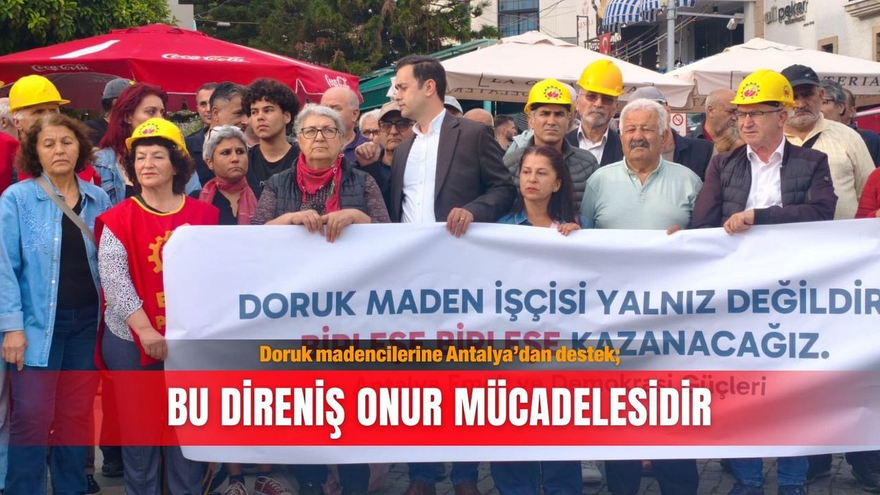 Antalya Emek ve Demokrasi Güçleri, Doruk Madencilik işçilerinin süren direnişine ilişkin basın açıklaması yaptı. Açıklamayı grup adına Sümeyra Göztepe okudu. Göztepe, Yıldızlar SSS Holding ve TMSF tarafından işçilerin haklarının gasp edildiğini öne sürerek, madencilerin 14 gündür direnişte, 5 gündür ise açlık grevinde olduğunu söyledi. Madencilerin yıllardır ödenmeyen hakları için maden sahasından Ankara’ya kadar yaklaşık 180 kilometre yürüdüğünü hatırlatan Göztepe, “Yürüyüş boyunca taleplerini kamuoyuna duyurdular, hazırladıkları raporu hem halka hem de 600 milletvekiline ilettiler. Ancak hâlâ çözüm adına tek bir adım atılmış değil” dedi. 2016 yılında TMSF tarafından el konulan madenin, 2022 Aralık ayında Yıldızlar SSS Holding’e devredildiğini belirten Göztepe, bu süreçten sonra işçilerin mağduriyetinin arttığını ifade etti. Göztepe, “TMSF devrederken işçilerin borçlarını sıfırlamadı, işten çıkarılanların haklarını ödemedi. Devir sonrası verilen sözler de tutulmadı” diye konuştu. Dönemin Cumhurbaşkanı Yardımcısı Fuat Oktay başta olmak üzere birçok yetkilinin sorunların çözüleceğine dair söz verdiğini dile getiren Göztepe, “Bugün gelinen noktada ne bu sözler tutuldu ne de işçilerin mağduriyeti giderildi” ifadelerini kullandı.