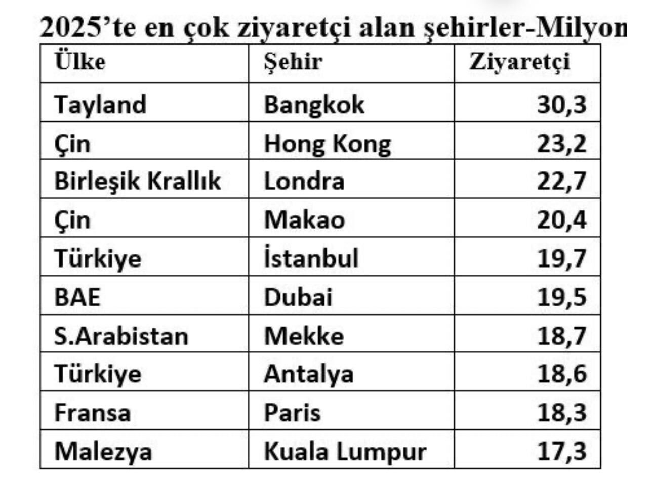 Araştırmada yaklaşık 17–18 milyonun üzerinde ziyaretçi sayısına ulaşan İstanbul, dünya sıralamasında 5’inci basamakta gösterildi. Türkiye’nin Akdeniz kıyısındaki en önemli tatil destinasyonlarından Antalya ise listede 8’inci sırada yer aldı.