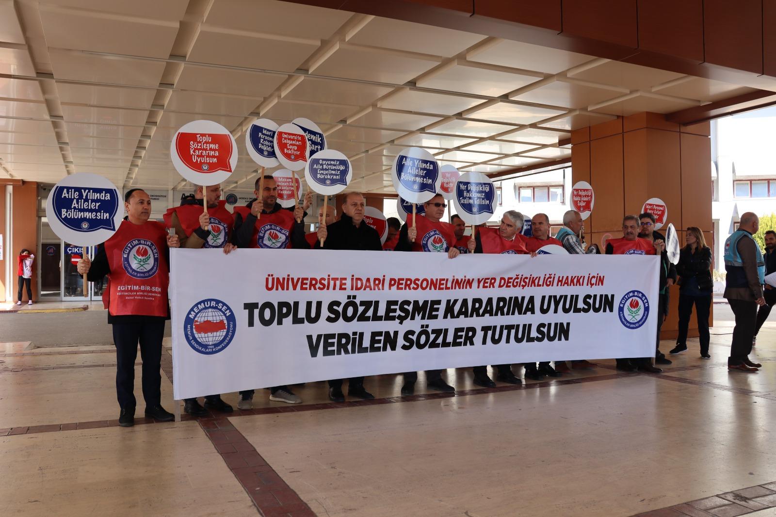 Eğitim Bir-Sen Antalya Şubesi, üniversite çalışanlarının özlük haklarının iyileştirilmesi ve yer değişikliği hakkının tanınması için Akdeniz Üniversitesi Tıp Fakültesi Hastanesi A Blok önünde bir araya gelerek basın açıklaması yaptı. Basın açıklamasını okuyan Eğitim Bir-Sen Antalya Şube Başkanı Eyüp Bülent Miran, üniversite idari personelinin başka bir kuruma geçiş yapmasının mevcut sistemde büyük zorluklarla karşılaştığını belirterek, “657 sayılı Devlet Memurları Kanunu’na tabi olarak istihdam edilen üniversite idari personeli, tüm üniversitelerde aynı yeterliliklere sahip olup benzer işlerde çalışmaktadır. Ancak diğer kamu kurumlarında görev yapan idari personel gibi merkezî yer değişikliği hakkından yararlanamamaktadır. Üniversite idari personelinin bir başka üniversiteye geçişi, tamamen çalıştıkları üniversitenin muvafakatine bağlıdır ve muvafakat verilmemesi durumunda uzun dava süreçleri yaşanmaktadır. Çoğu zaman bu süreçler çalışanların aleyhine sonuçlanmakta ve ciddi mağduriyetlere yol açmaktadır” dedi. Üniversiteler arası yer değişikliği işlemlerinin toplu sözleşme hükmüne dayanarak Yükseköğretim Kurulu (YÖK) tarafından düzenlenmesi gerektiğini belirten Miran, bu düzenlemenin üniversite çalışanlarının kariyer planlamalarını yapabilmelerine ve kamu hizmetlerinde verimliliğin artmasına katkı sağlayacağını vurguladı.